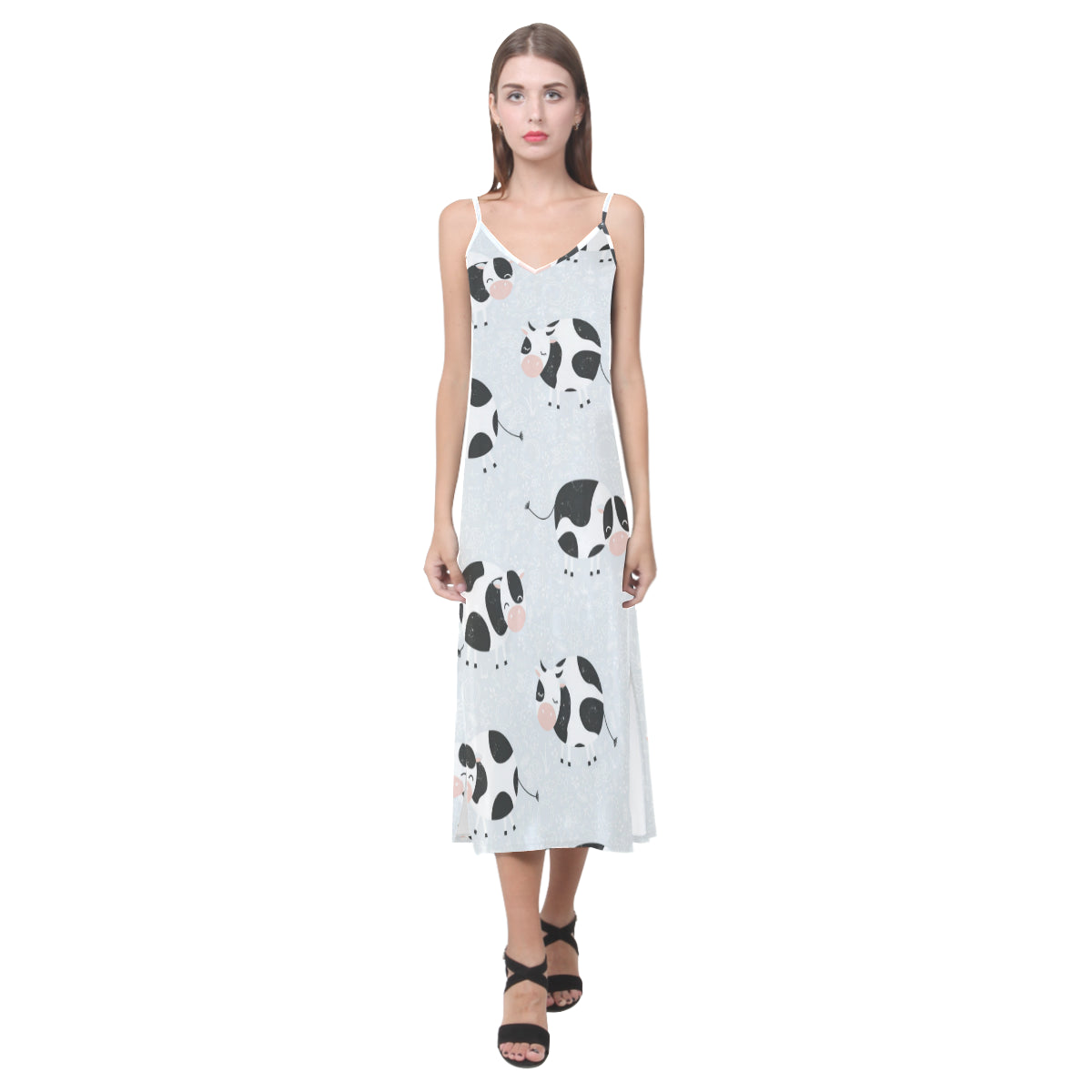 Cute cows pattern V-Neck Open Fork Long Dress is a uniqued design and limited item. It made to order, hand printed, and sewn with love in our factory.