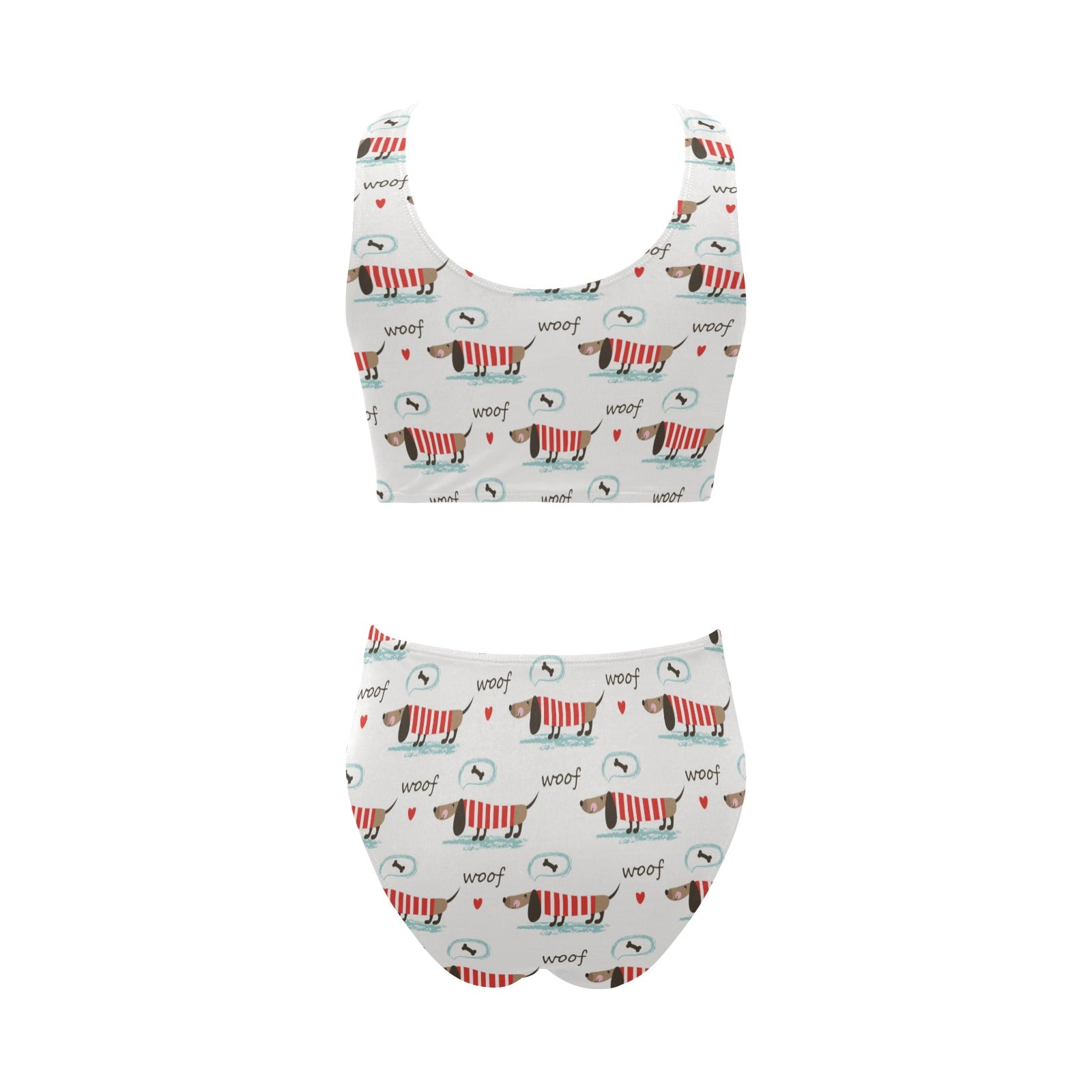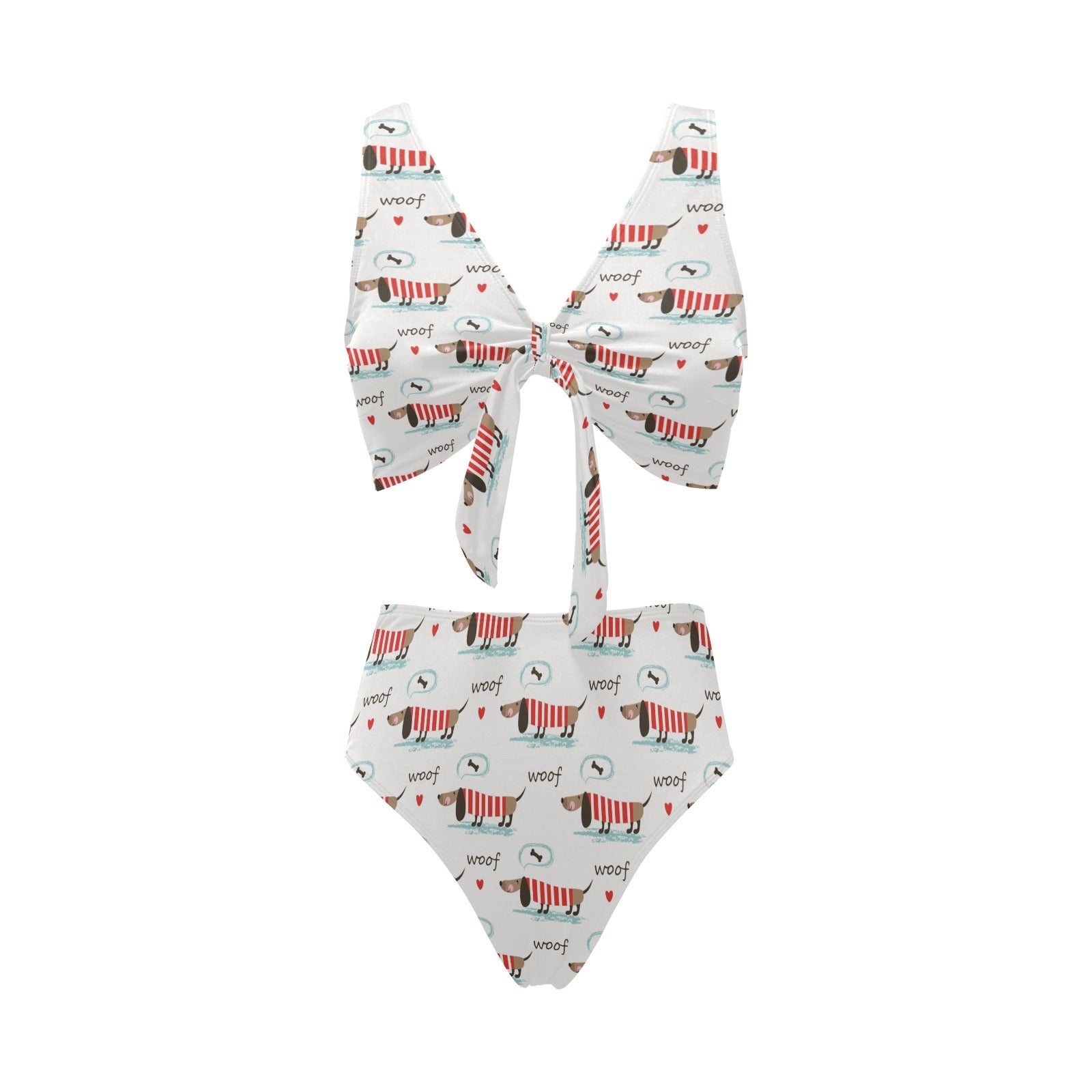 Cute dachshund bone pattern Chest Bowknot High Waisted Bikini Swimsuit