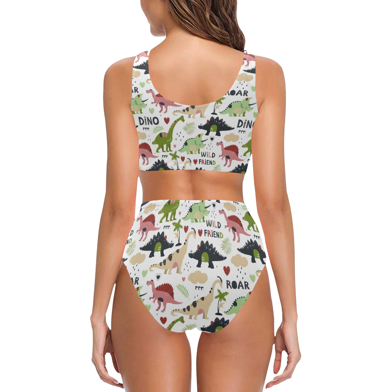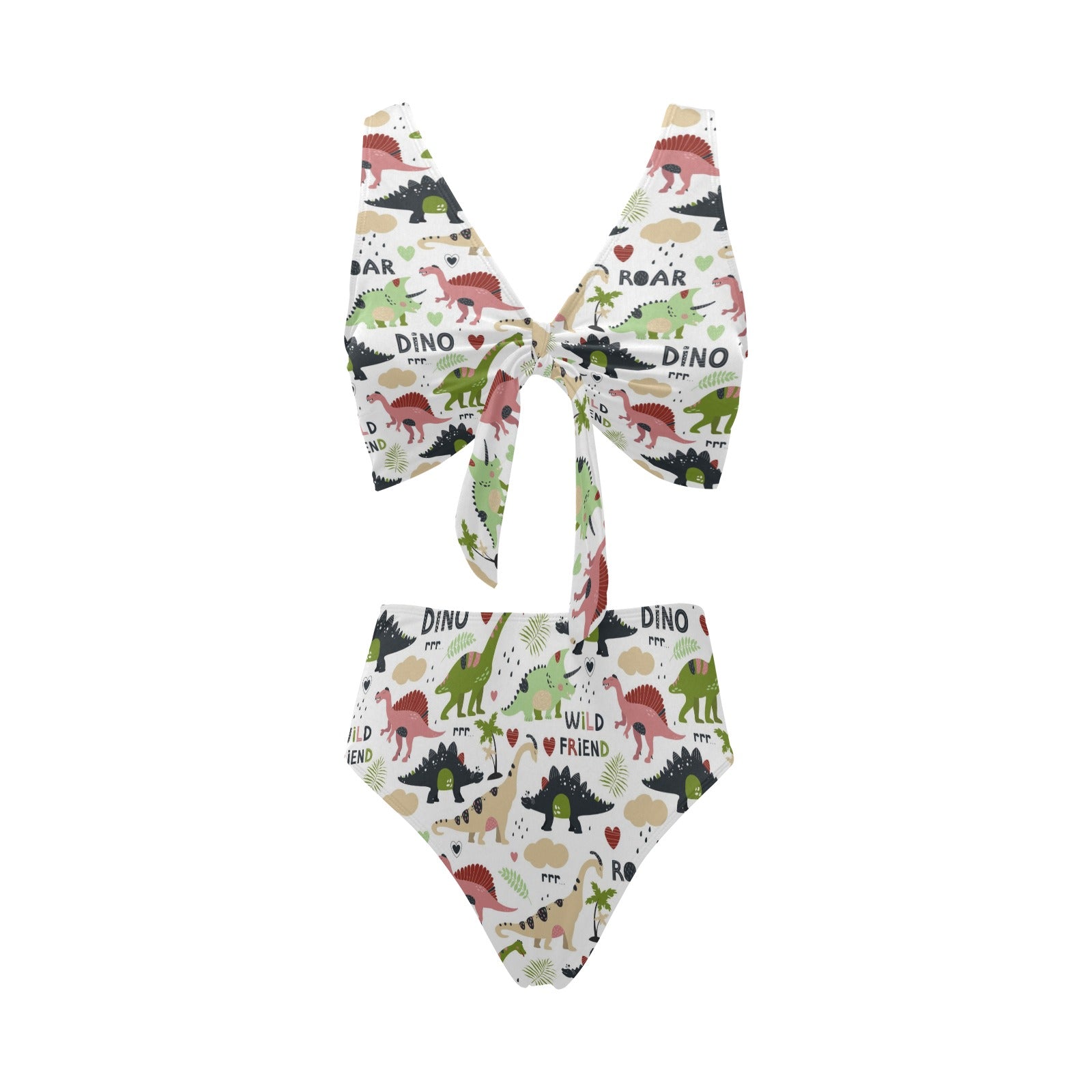 Cute dinosaurs pattern Chest Bowknot High Waisted Bikini Swimsuit