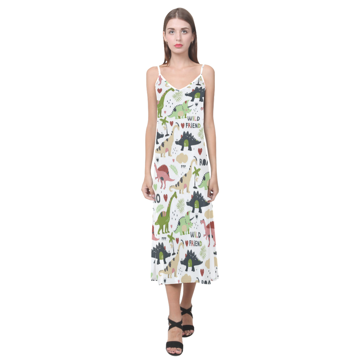 Cute dinosaurs pattern V-Neck Open Fork Long Dress