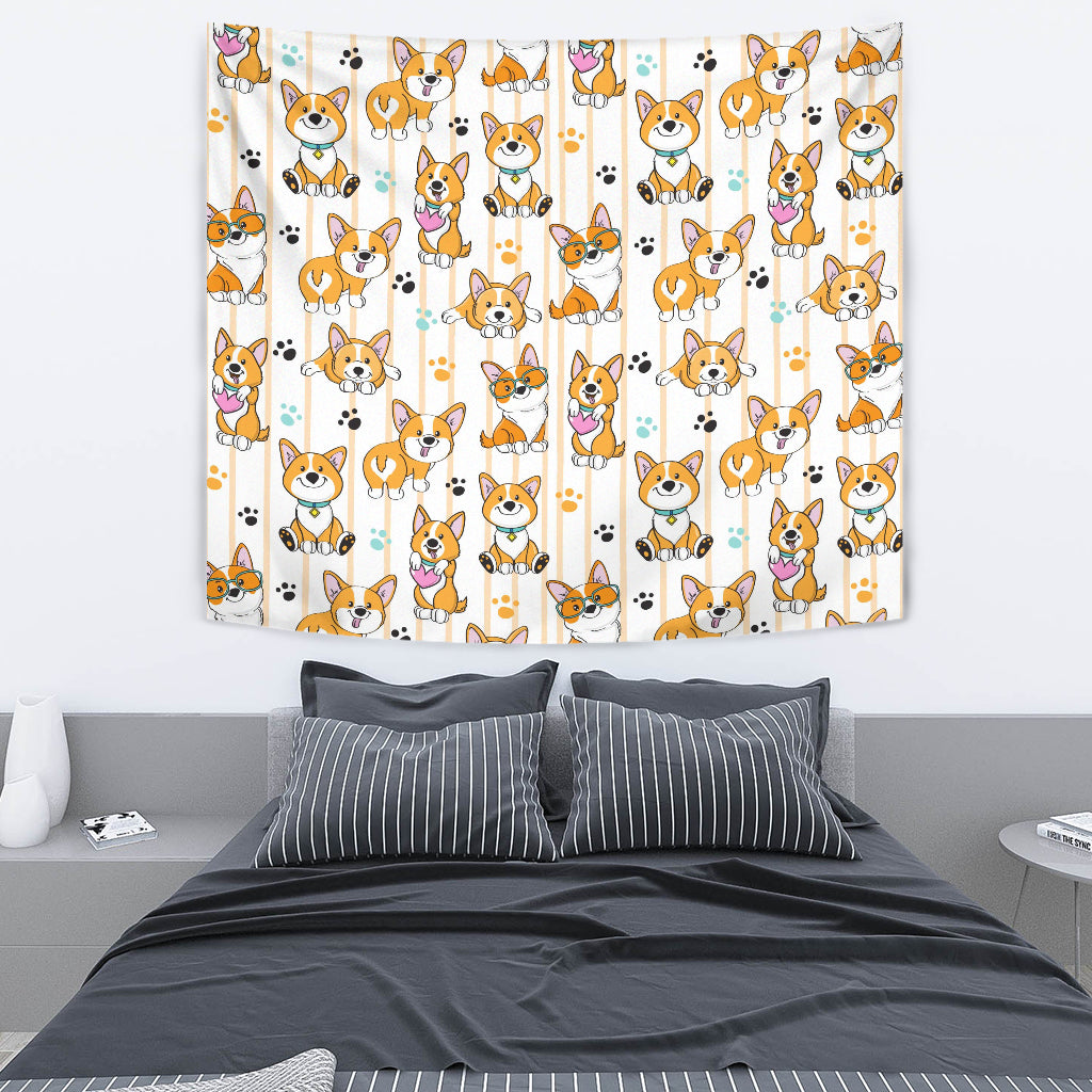 Cute Dog Corgi Striped Background Pattern Wall Tapestry