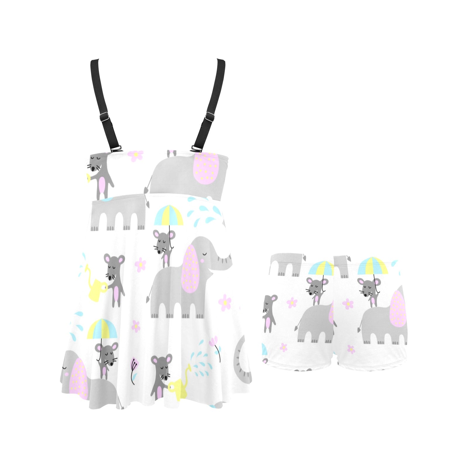 Cute elephant mouse pattern Chest Sexy Pleated Two Piece Swim Dress