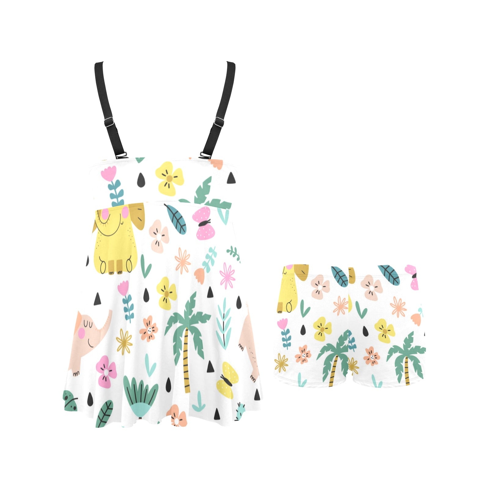 Cute elephants palm tree flower butterfly pattern Chest Sexy Pleated Two Piece Swim Dress