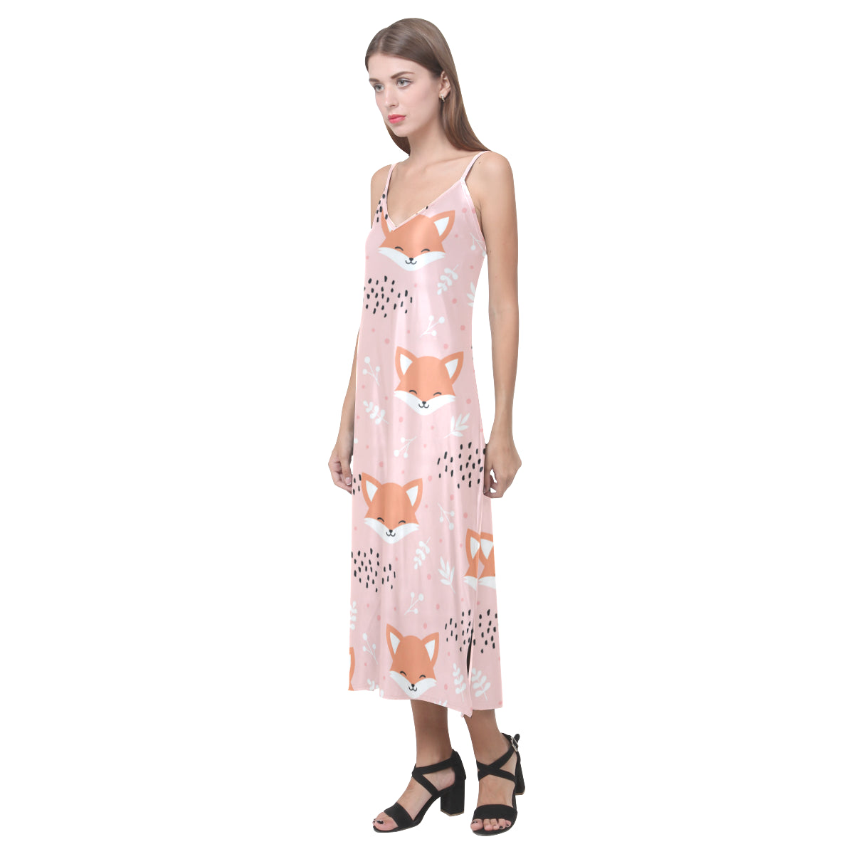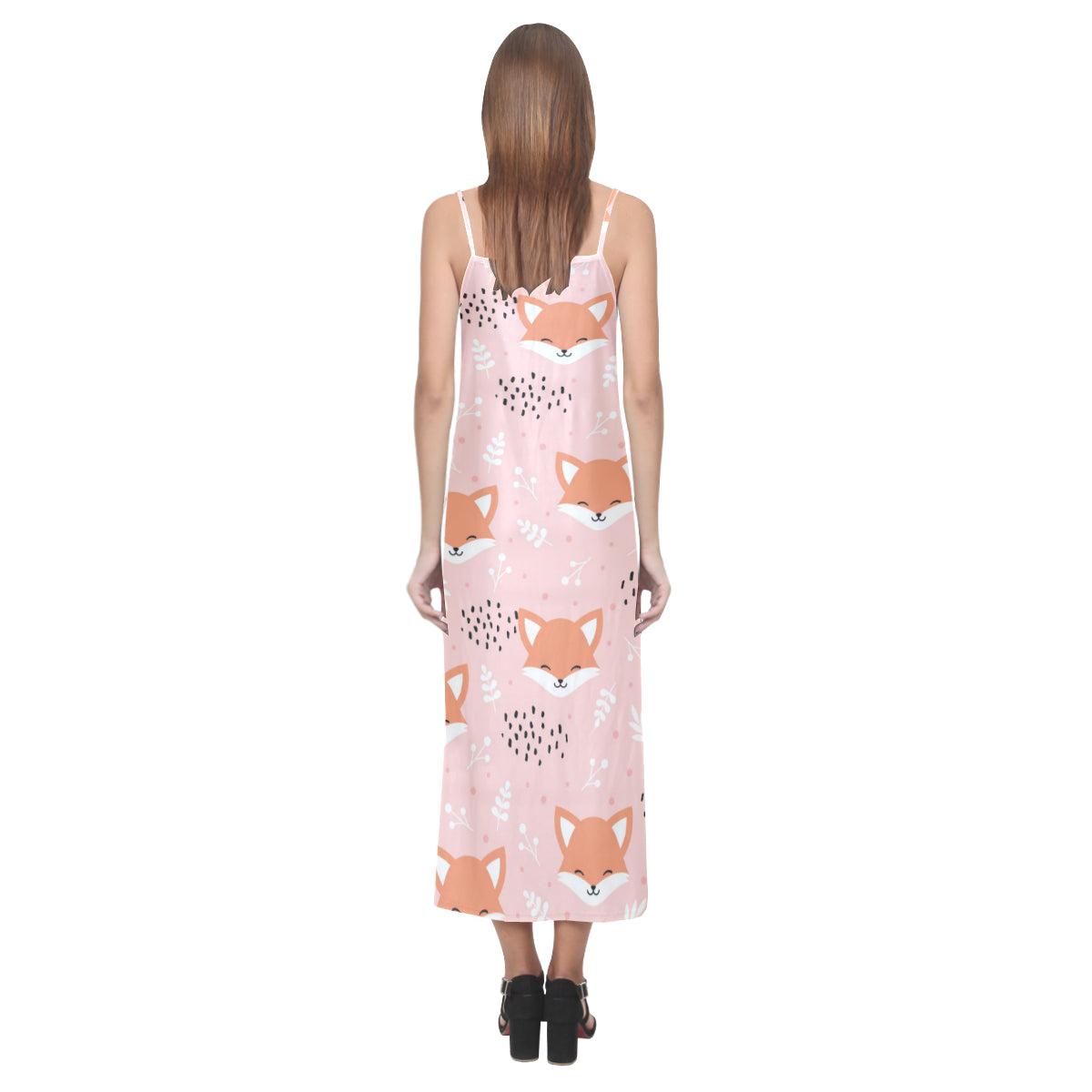Cute fox pattern pink background V-Neck Open Fork Long Dress is a uniqued design and limited item. It made to order, hand printed, and sewn with love in our factory.