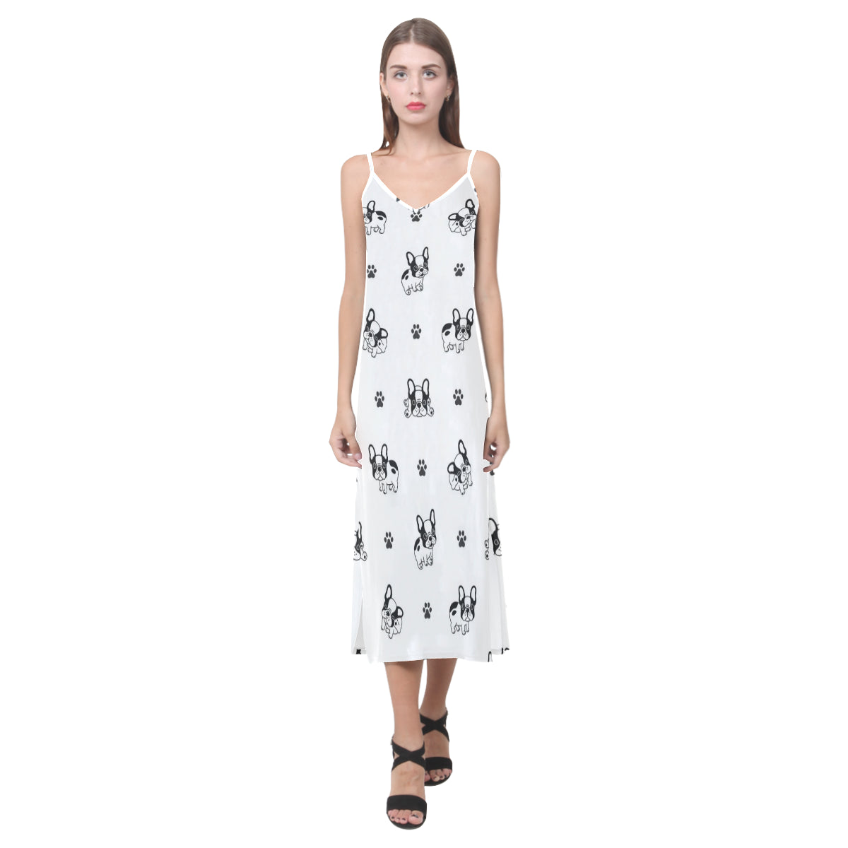 Cute french bulldog paw pattern V-Neck Open Fork Long Dress is a uniqued design and limited item. It made to order, hand printed, and sewn with love in our factory.