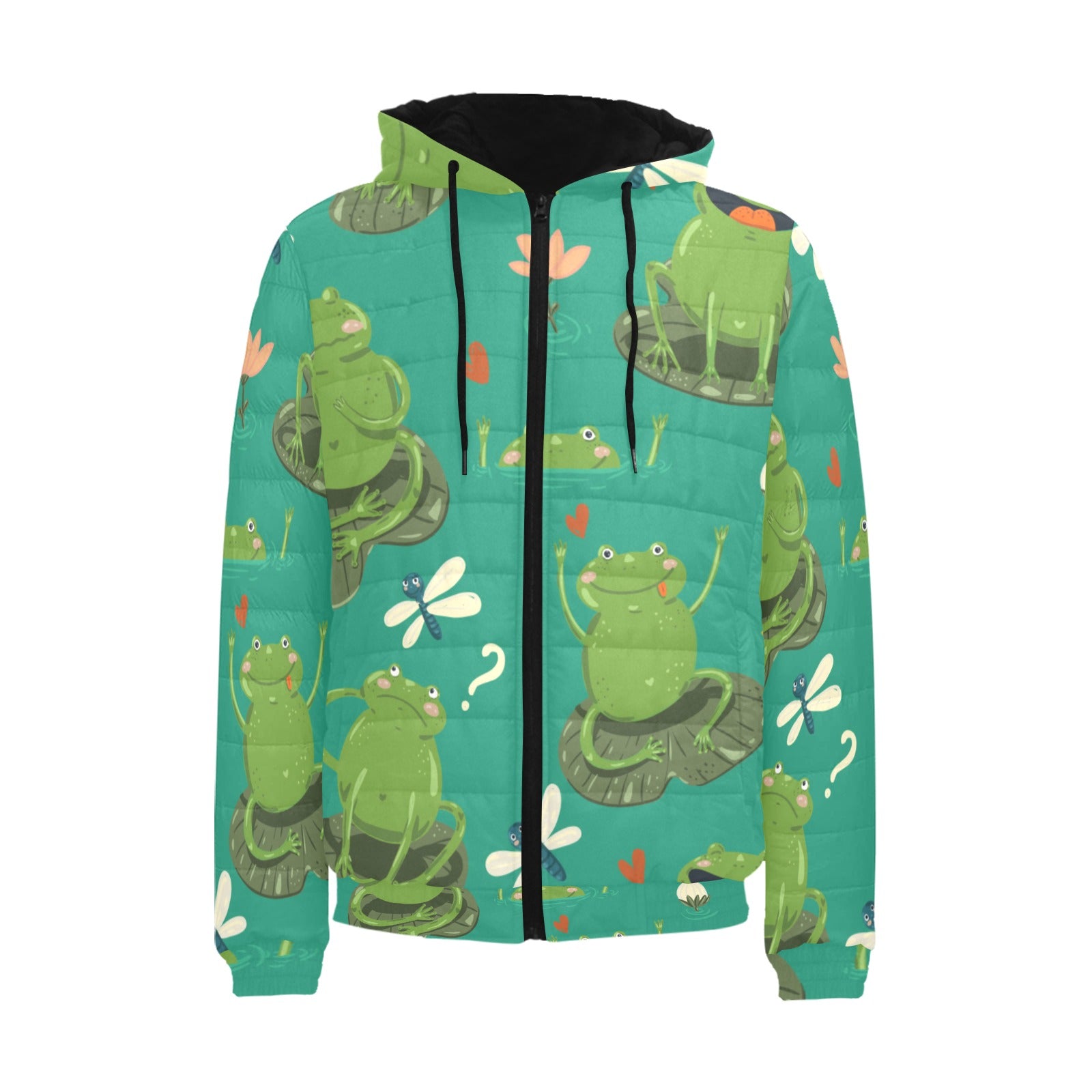 Cute frog dragonfly design pattern Men's Padded Hooded Jacket