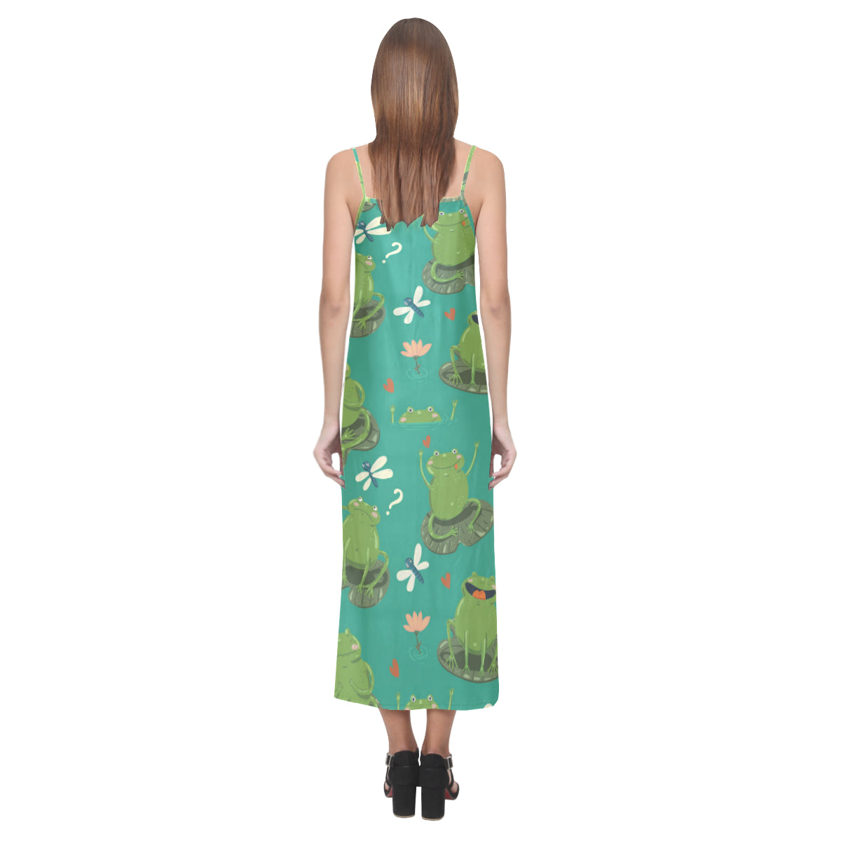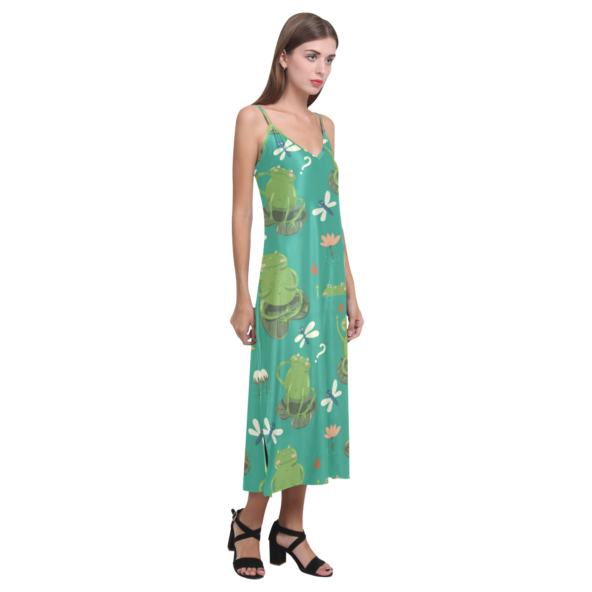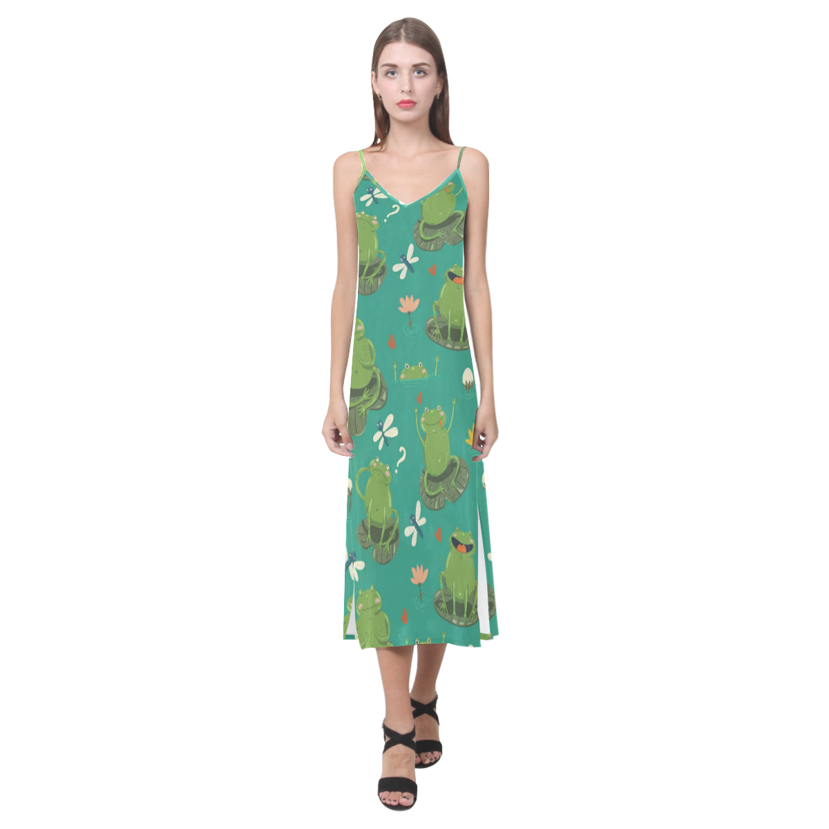 Cute frog dragonfly design pattern V-Neck Open Fork Long Dress