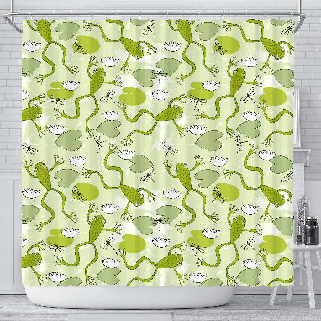 Cute frog dragonfly pattern Shower Curtain is a uniqued design and limited item. It made to order, hand printed, and sewn with love in our factory.