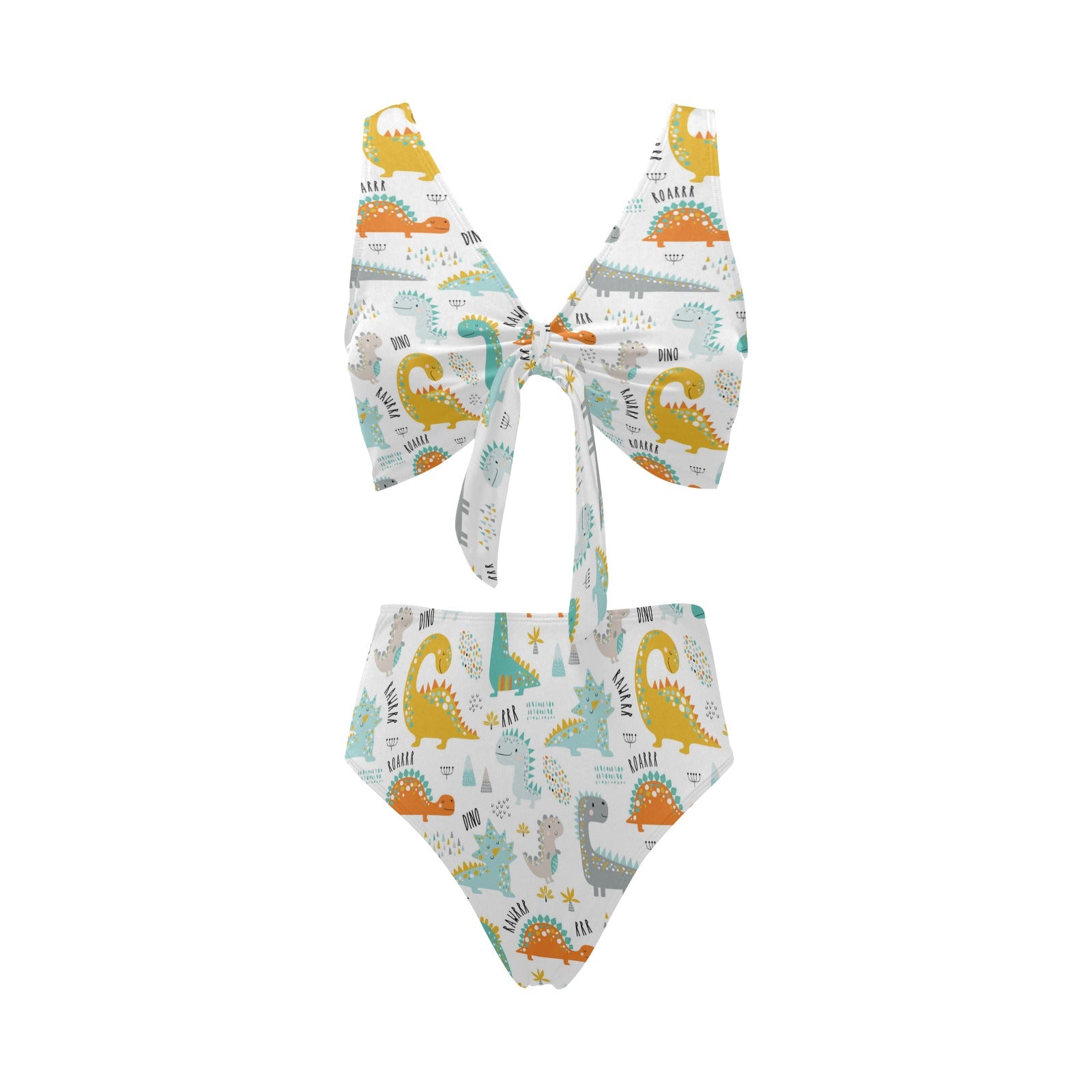 Cute funny kids dinosaurs pattern Chest Bowknot High Waisted Bikini Swimsuit