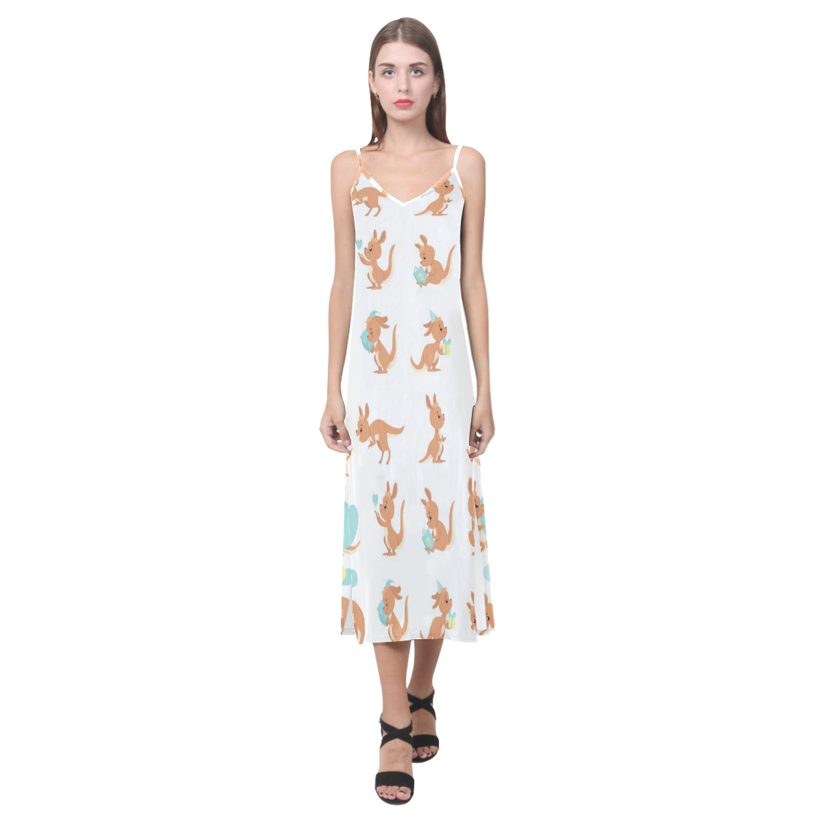 Cute Kangaroo pattern V-Neck Open Fork Long Dress is a uniqued design and limited item. It made to order, hand printed, and sewn with love in our factory.