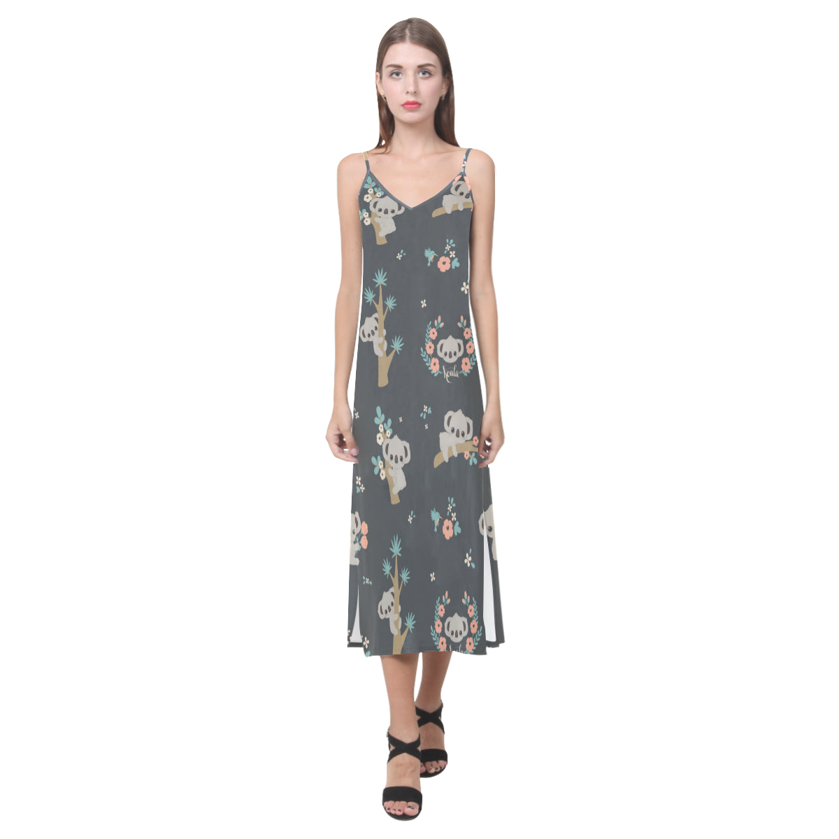Cute koala pattern V-Neck Open Fork Long Dress is a uniqued design and limited item. It made to order, hand printed, and sewn with love in our factory.