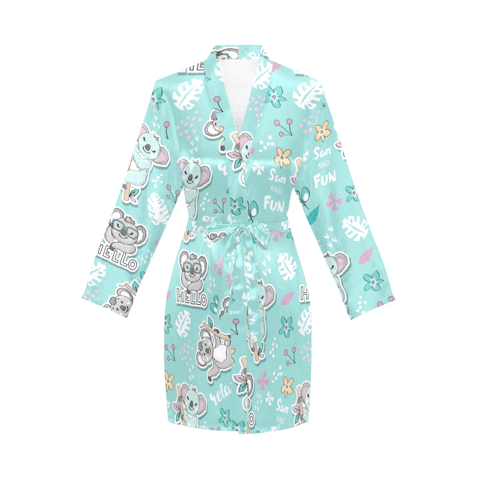 Cute koalas blue background pattern Women's Long Sleeve Belted Night Robe