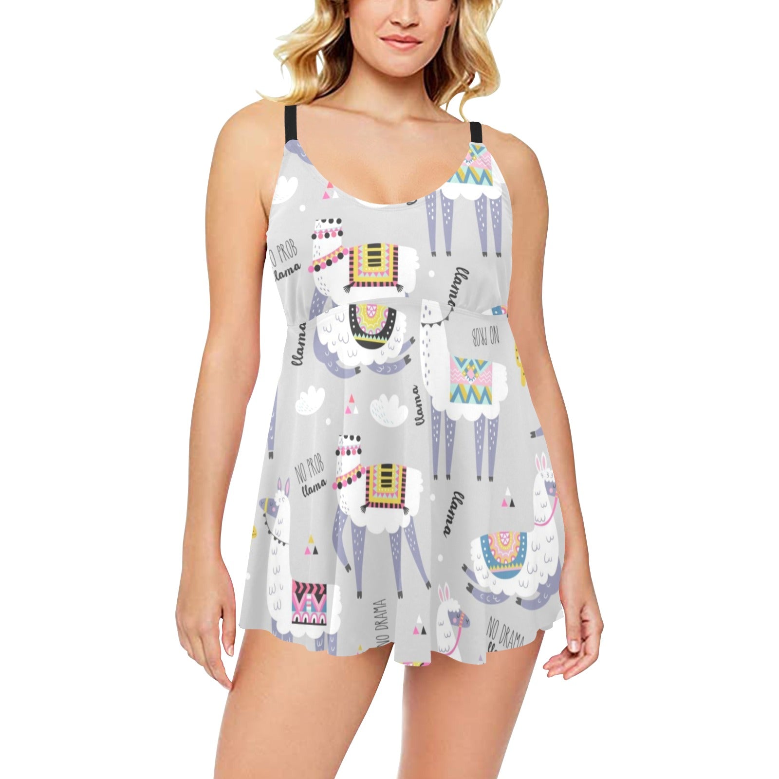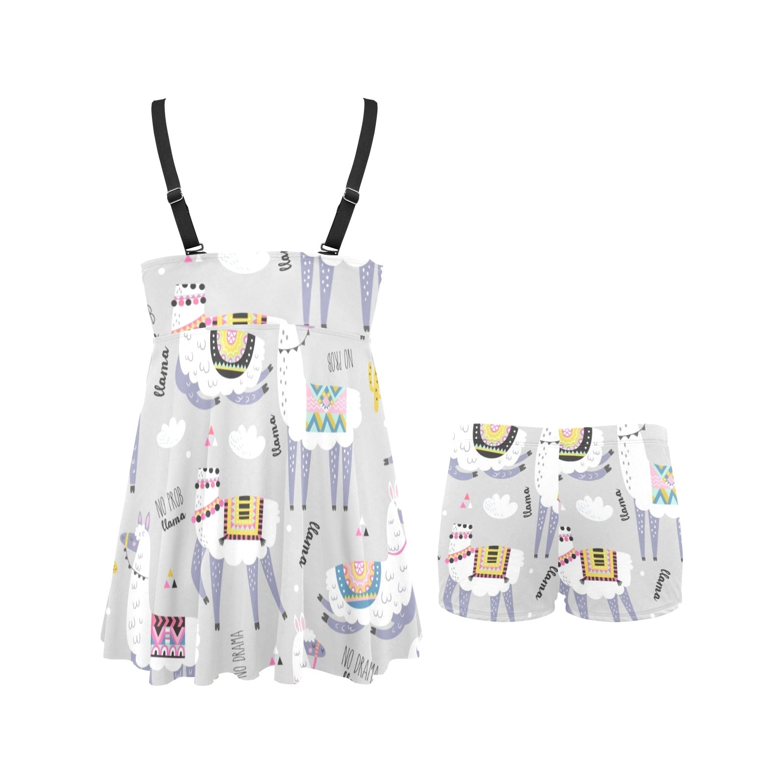 Cute Llama Alpaca pattern Chest Sexy Pleated Two Piece Swim Dress