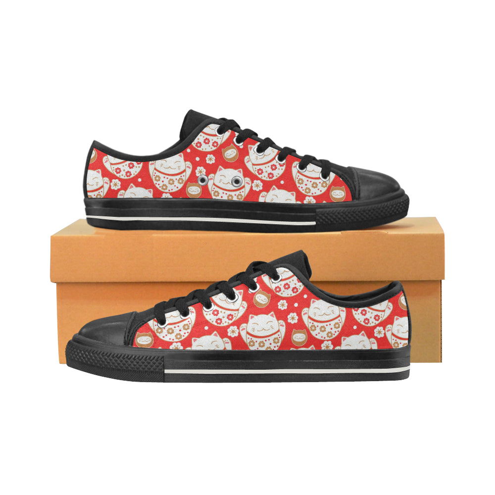 Cute Maneki neko cat red background Men's Low Top Canvas Shoes Black