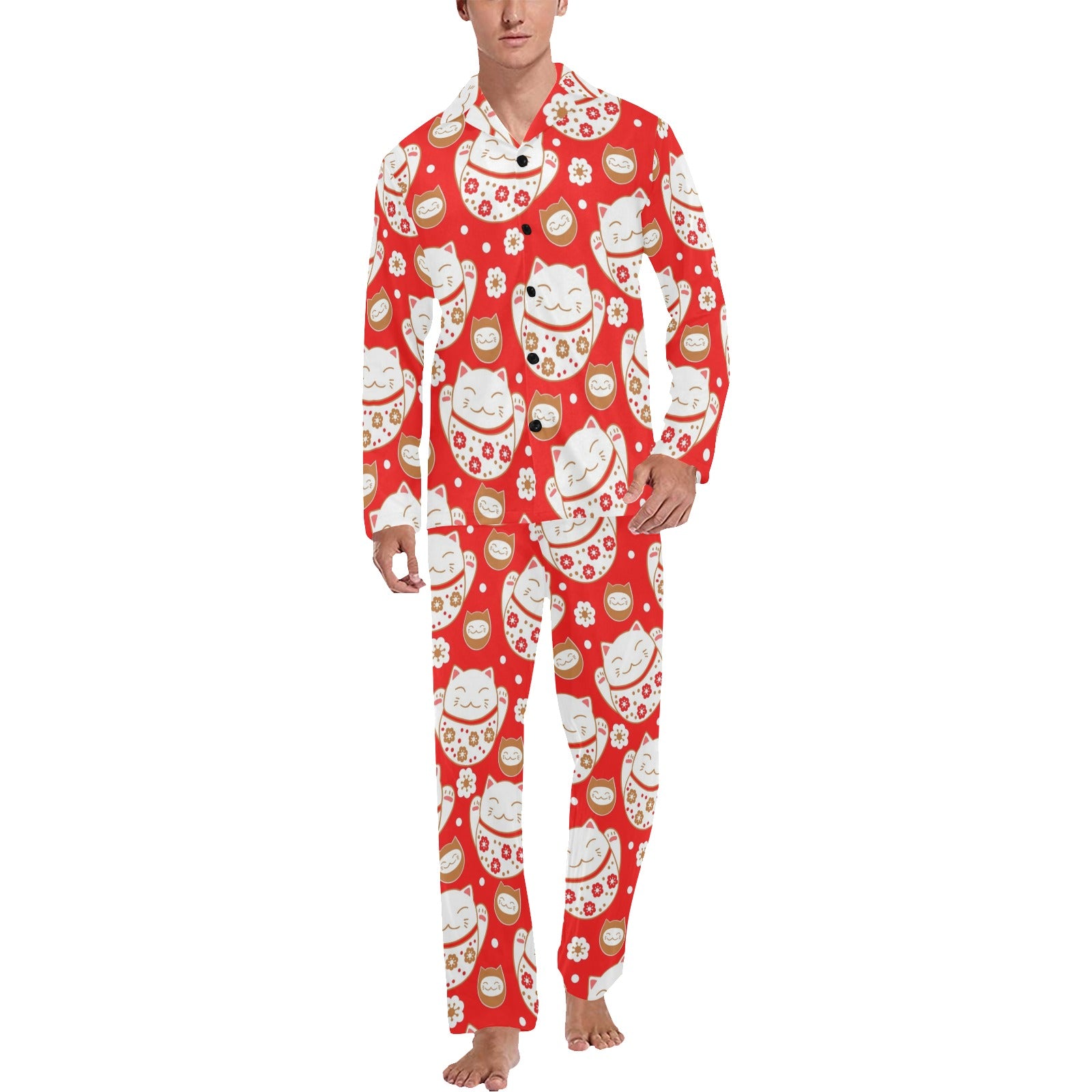 Cute Maneki neko cat red background Men's Long Pajama Set