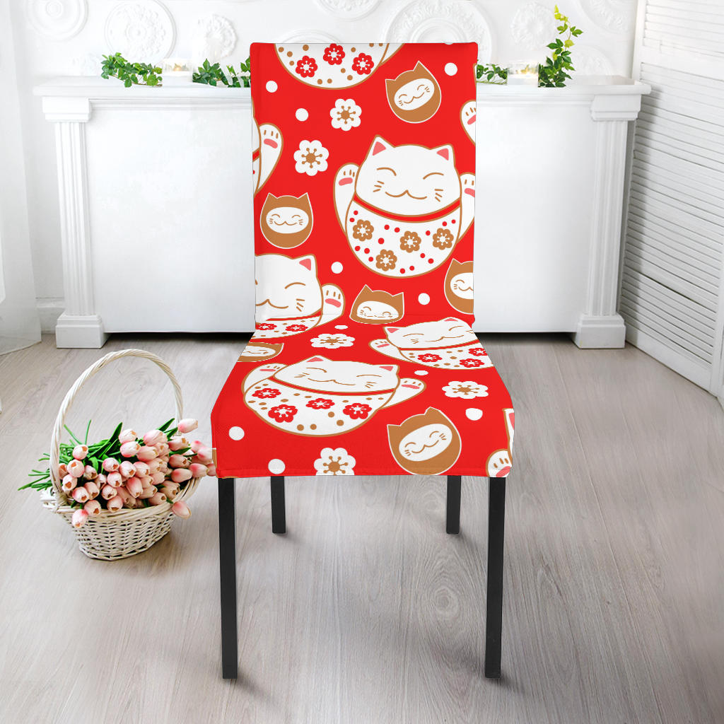 Cute Maneki Neko Lucky Cat Red Background Dining Chair Slipcover