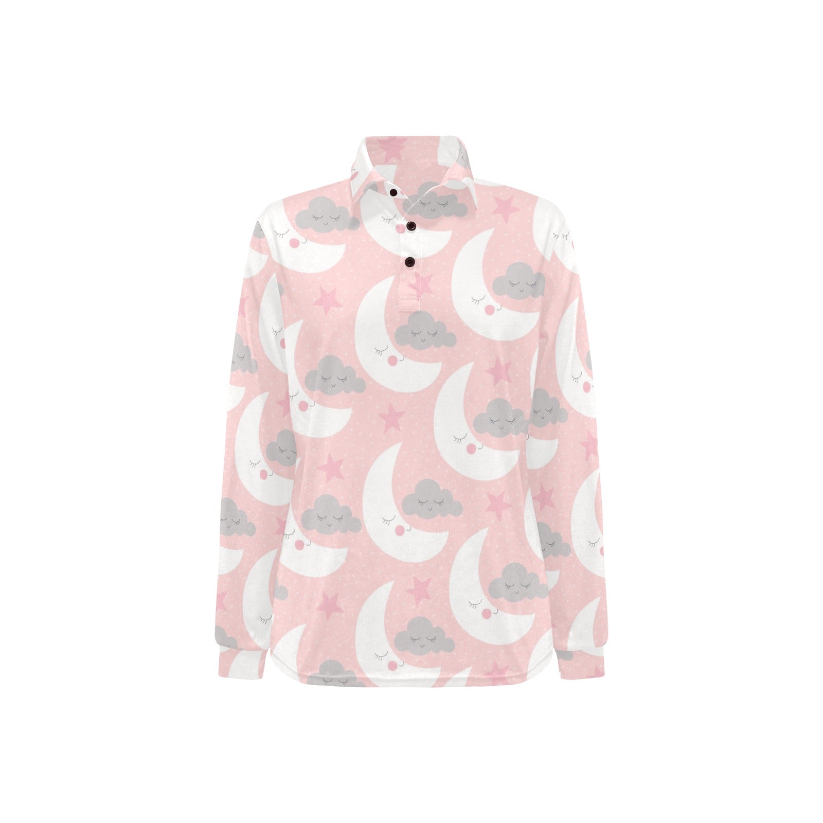Cute moon cloud star pattern pink dot background Women's Long Sleeve Polo Shirt