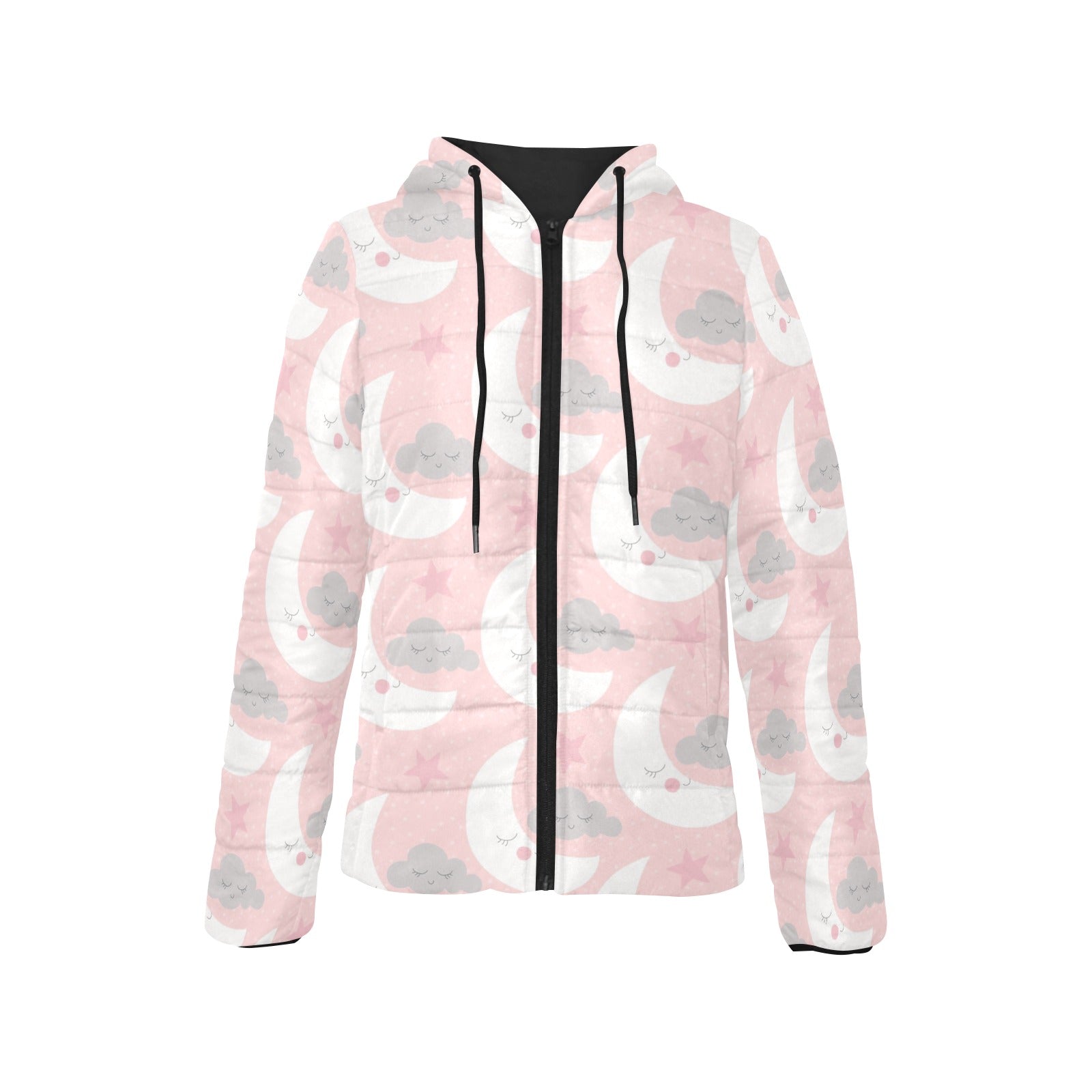 Cute moon cloud star pattern pink dot background Women's Padded Hooded Jacket