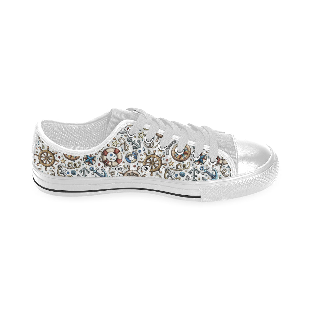 Cute nautical steering wheel anchor pattern Men's Low Top Canvas Shoes White