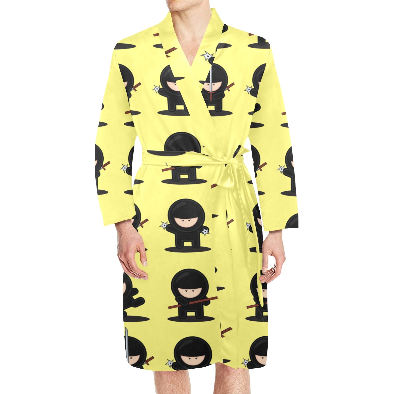 Cute ninja yellow background Men's Long Sleeve Belted Night Robe