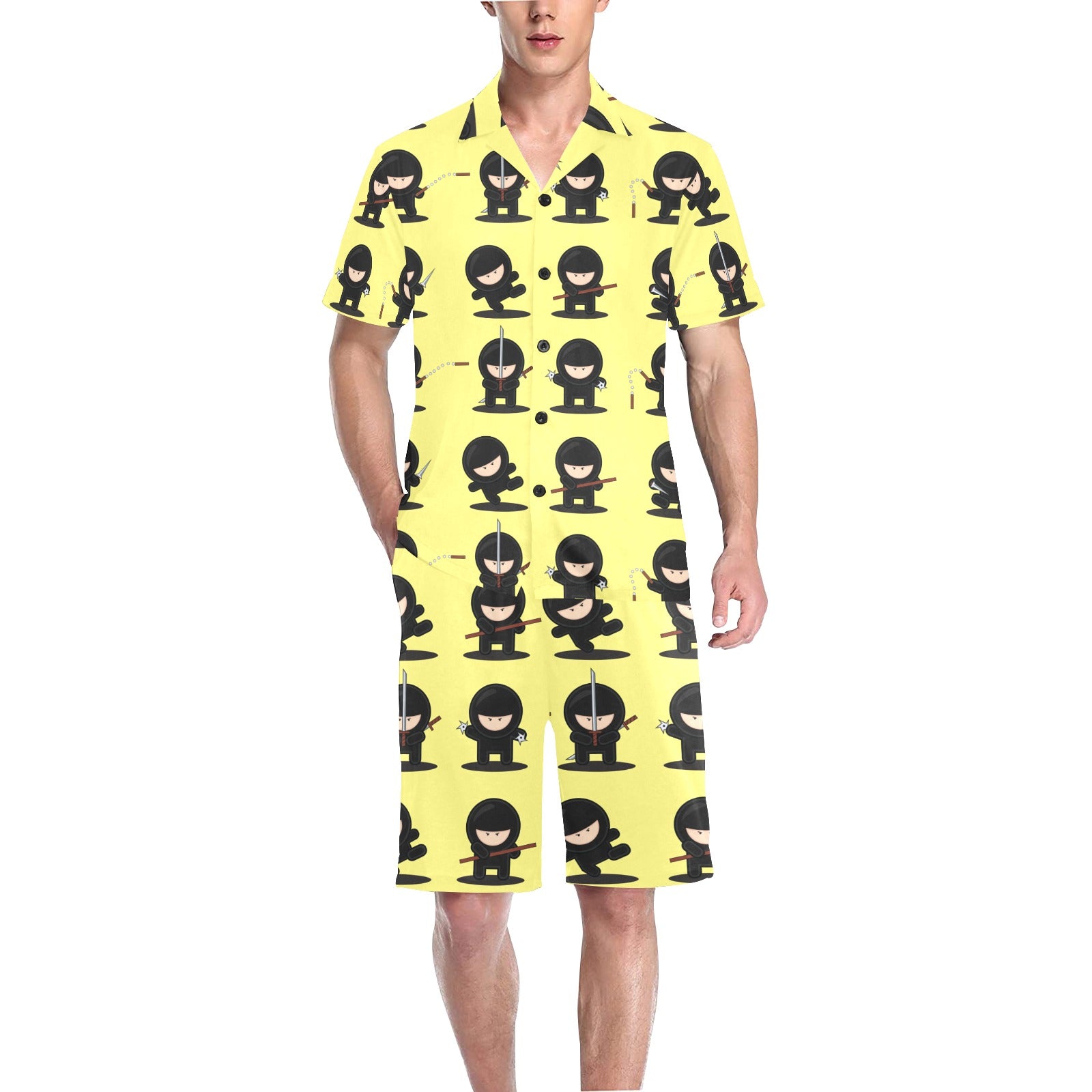 Cute ninja yellow background Men's V-Neck Short Pajama Set