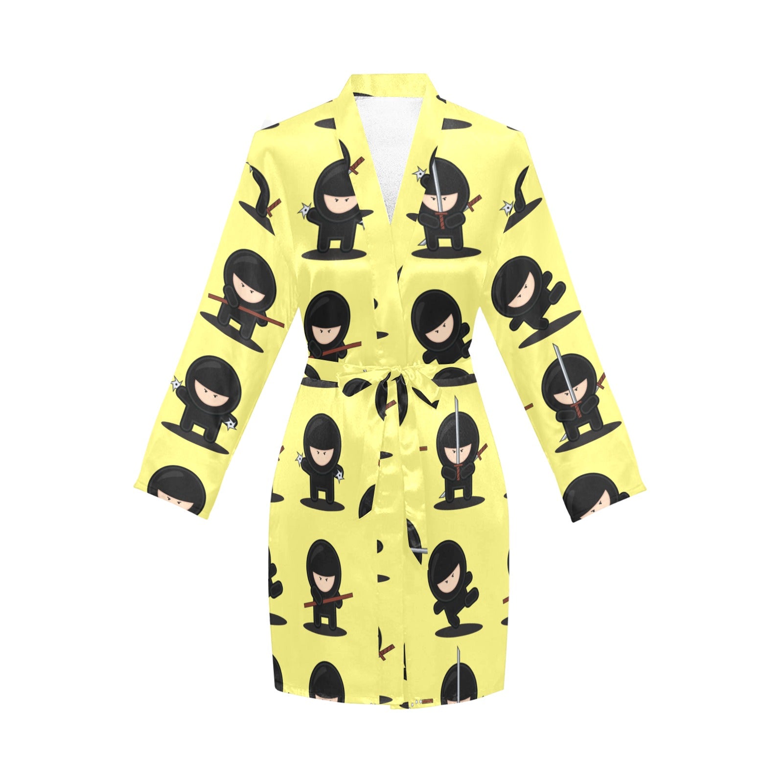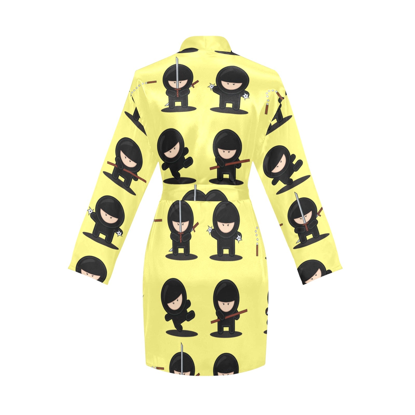 Cute ninja yellow background Women's Long Sleeve Belted Night Robe