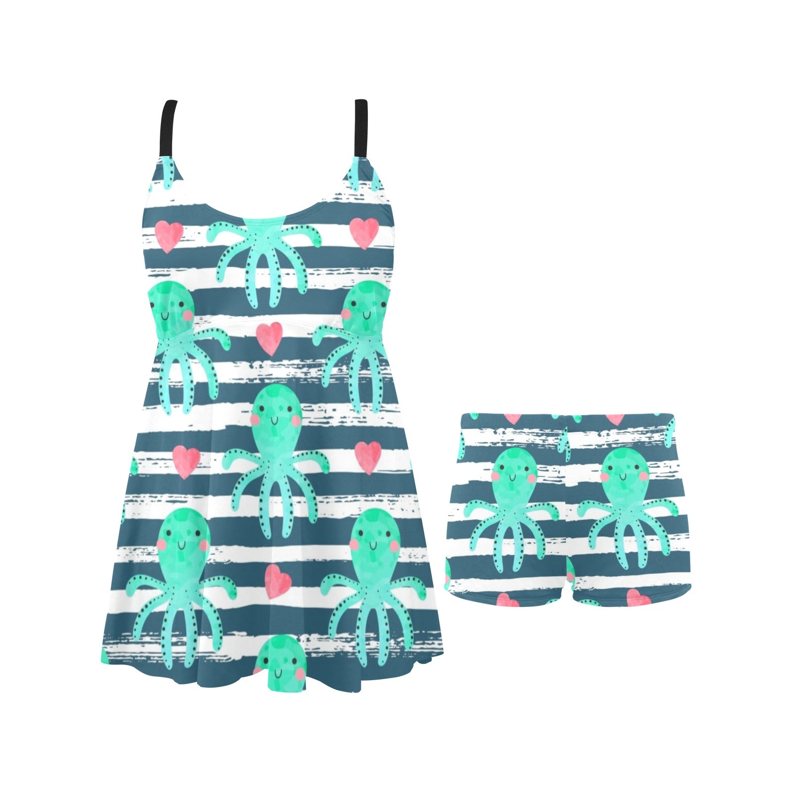Cute octopuses heart striped background Chest Sexy Pleated Two Piece Swim Dress
