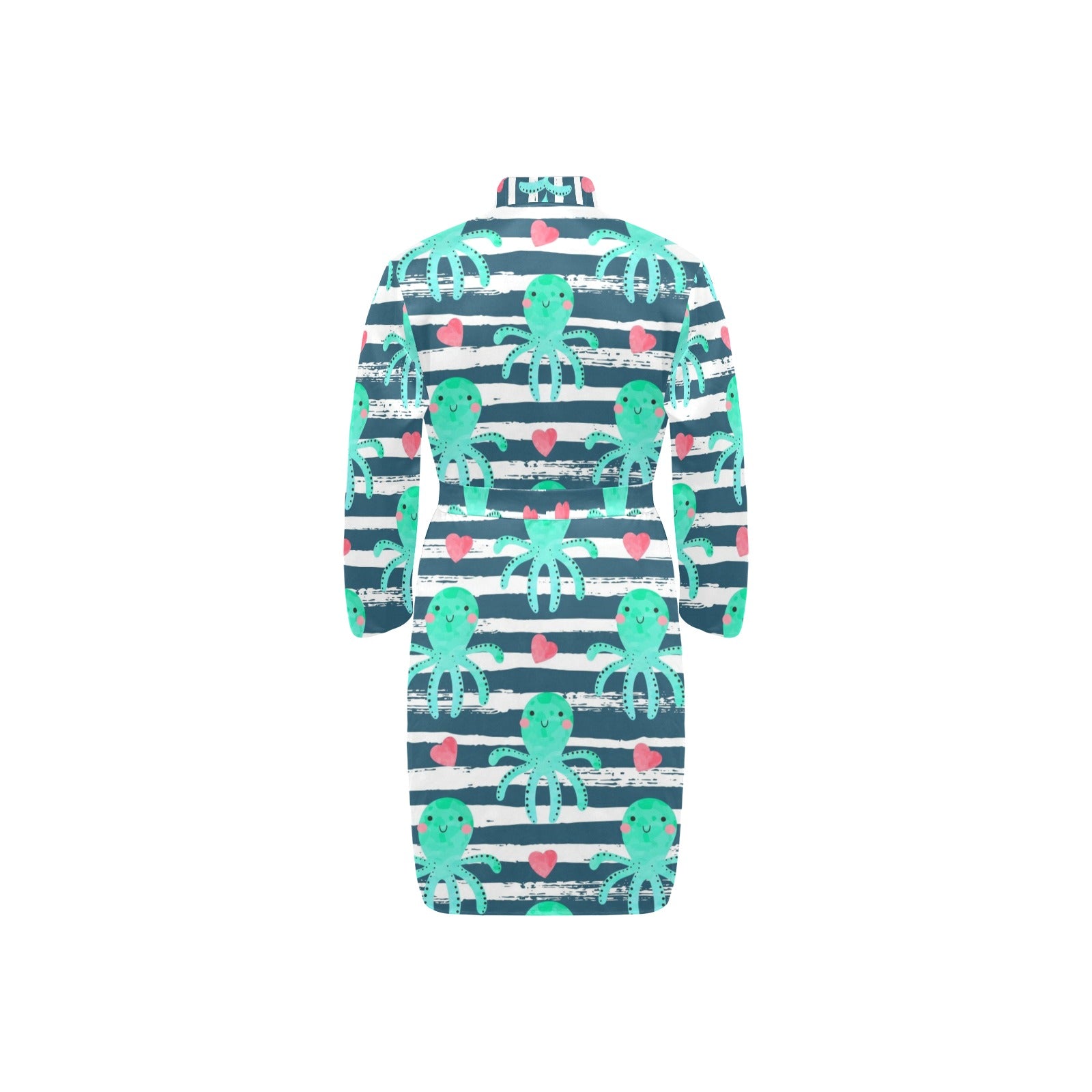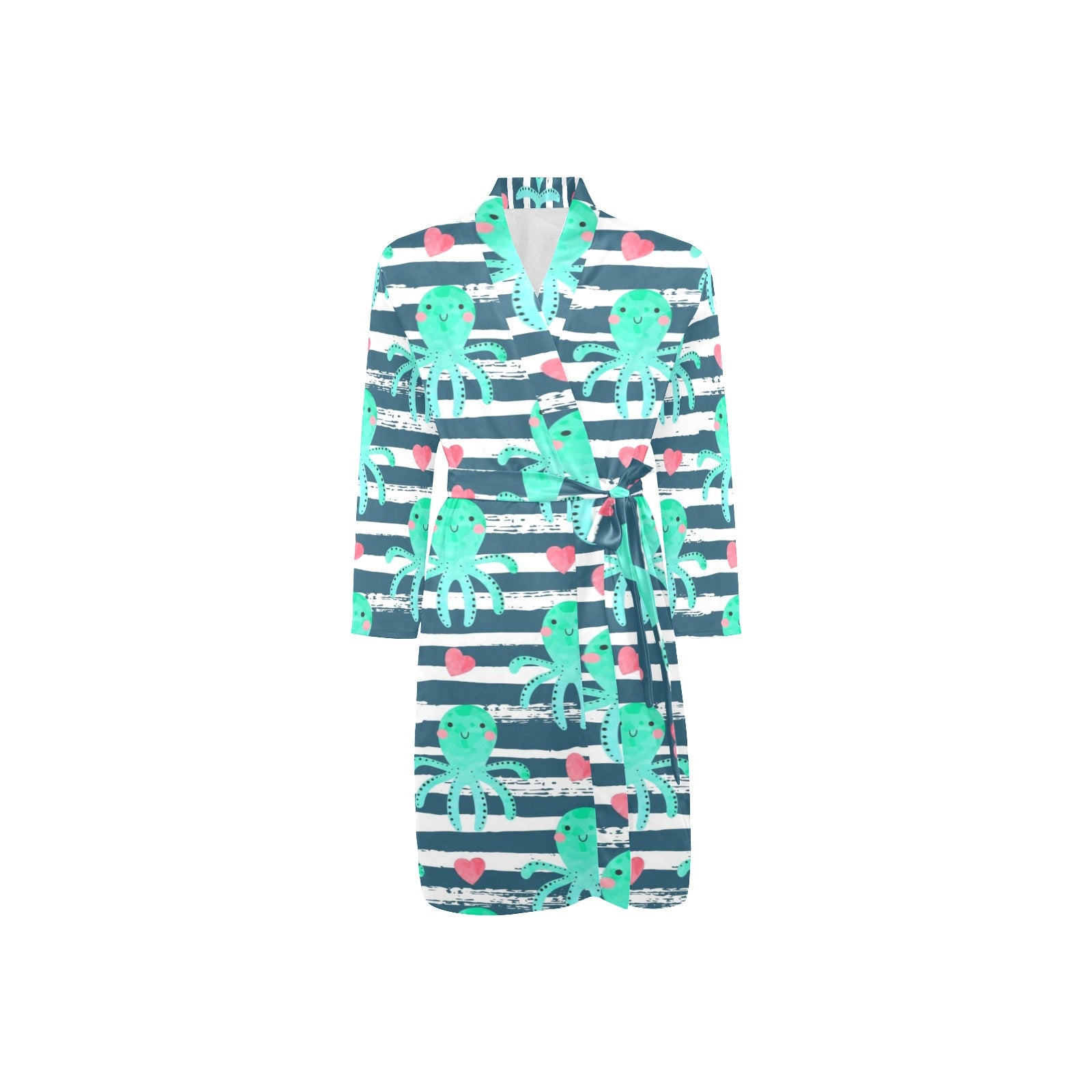 Cute octopuses heart striped background Men's Long Sleeve Belted Night Robe