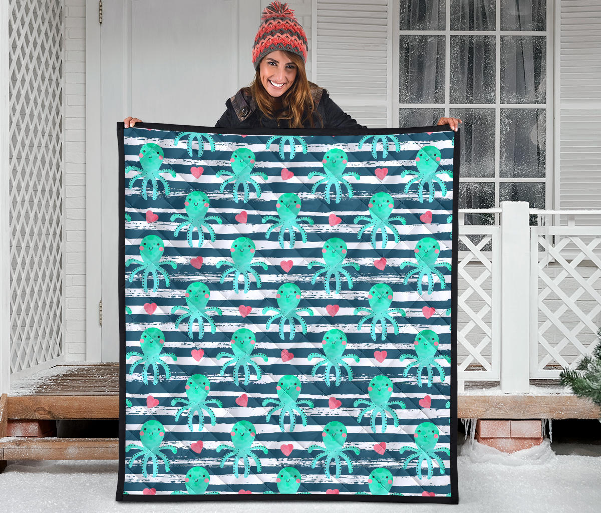 Cute Octopuses Heart Striped Background Premium Quilt is a uniqued design and limited item. It made to order, hand printed, and sewn with love in our factory.