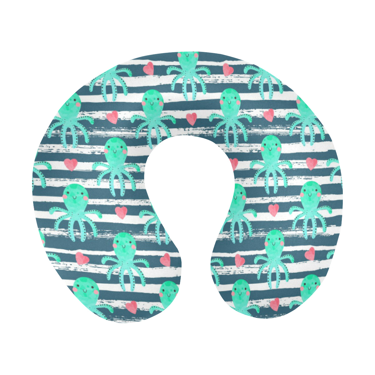 Cute octopuses heart striped background U-Shaped Travel Neck Pillow