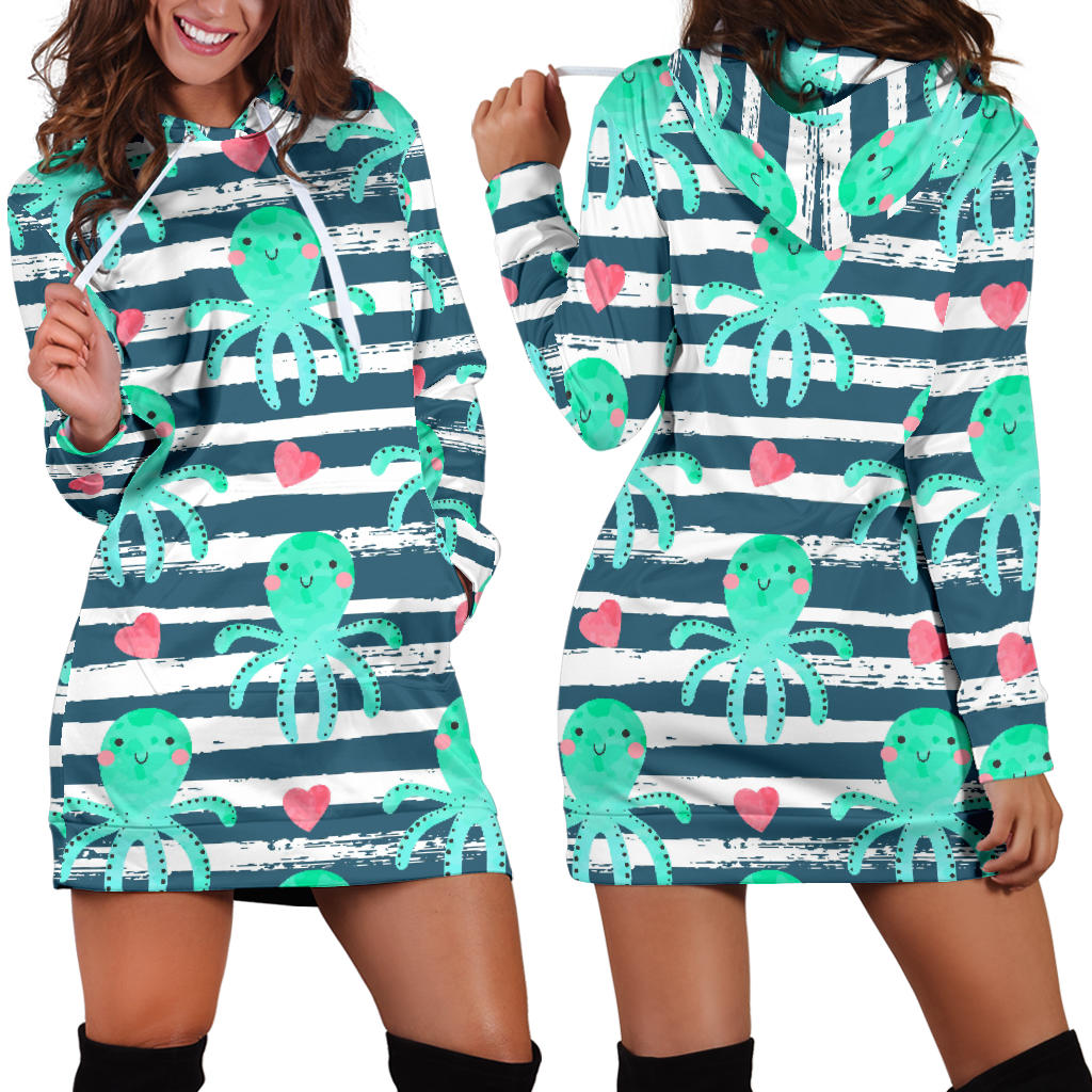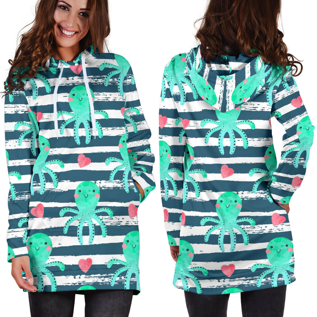 Cute octopuses heart striped background Women's Hoodie Dress is a uniqued design and limited item. It made to order, hand printed, and sewn with love in our factory.