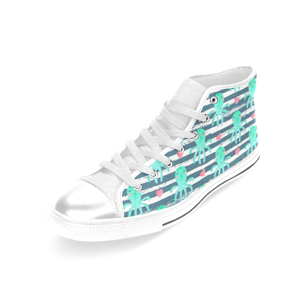 Cute octopuses heart striped background Women's High Top Canvas Shoes White