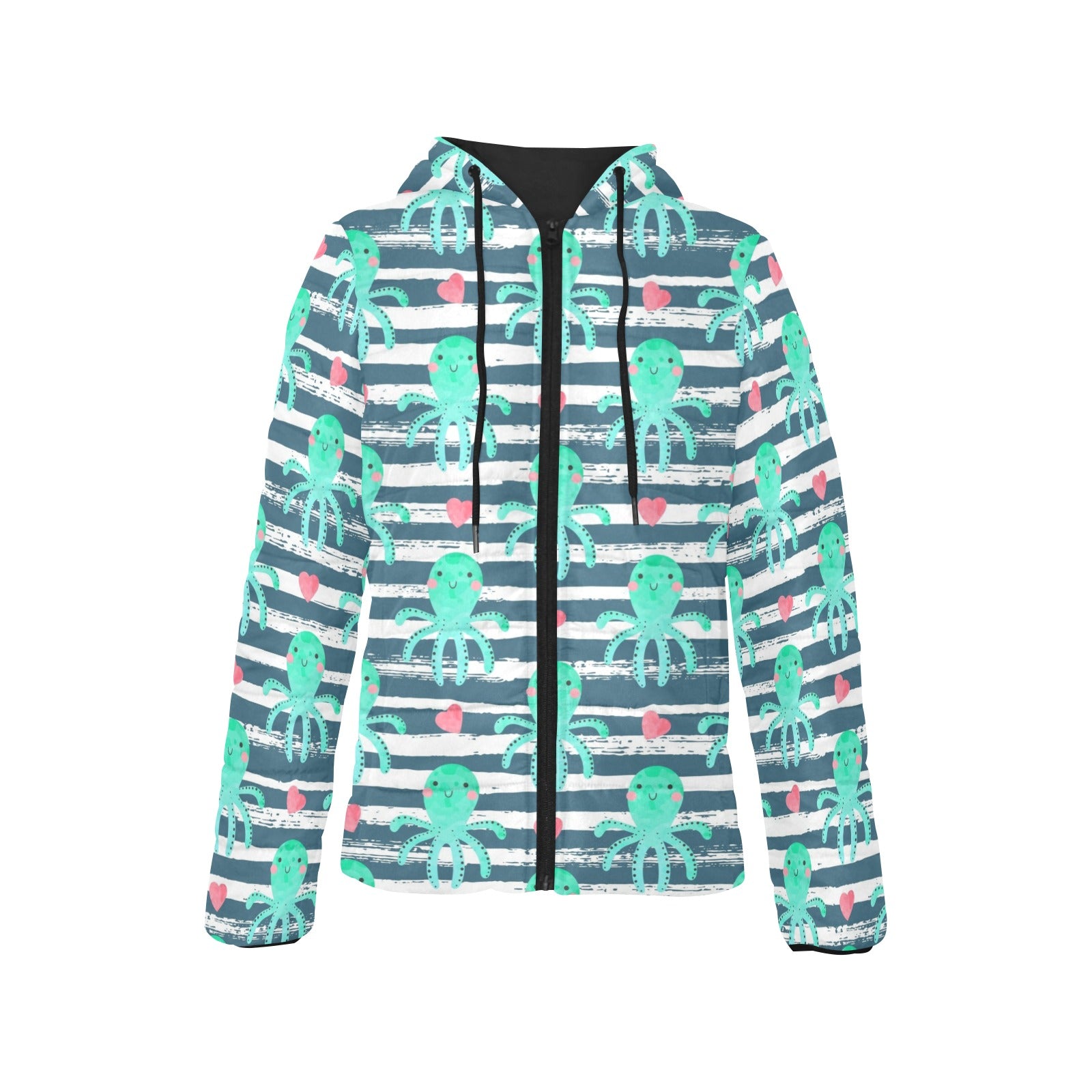 Cute octopuses heart striped background Women's Padded Hooded Jacket