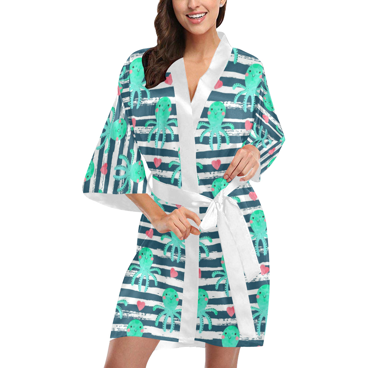 Cute octopuses heart striped background Women's Short Kimono Robe is a uniqued design and limited item. It made to order, hand printed, and sewn with love in our factory.