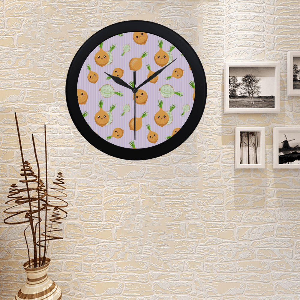 cute onions smiling faces purple background Elegant Black Wall Clock is a uniqued design and limited item. It made to order, hand printed, and sewn with love in our factory.