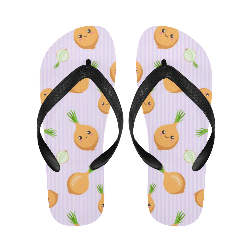 cute onions smiling faces purple background Unisex Flip Flops is a uniqued design and limited item. It made to order, hand printed, and sewn with love in our factory.