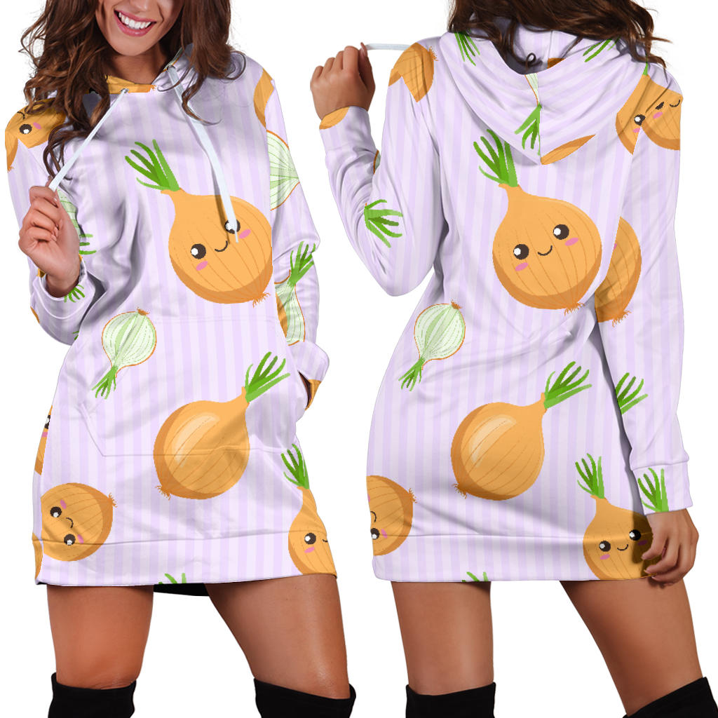 cute onions smiling faces purple background Women's Hoodie Dress is a uniqued design and limited item. It made to order, hand printed, and sewn with love in our factory.