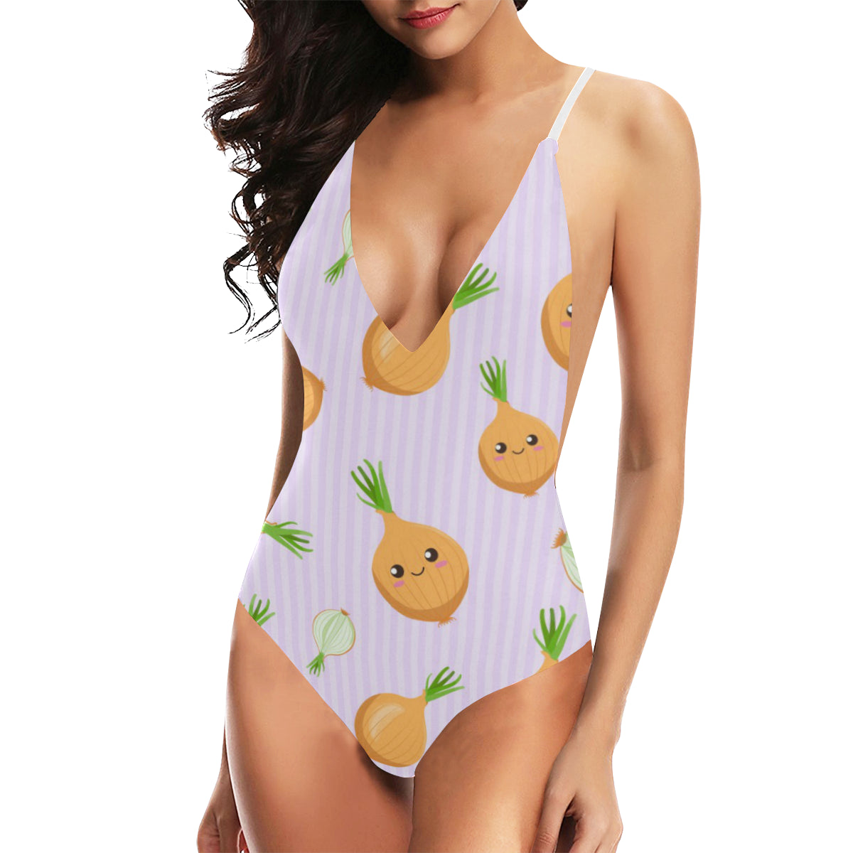 cute onions smiling faces purple background Women's One-Piece Swimsuit is a uniqued design and limited item. It made to order, hand printed, and sewn with love in our factory.