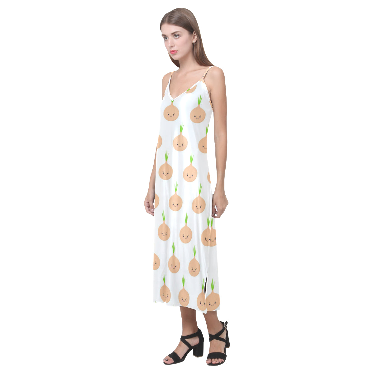 cute onions smiling faces V-Neck Open Fork Long Dress is a uniqued design and limited item. It made to order, hand printed, and sewn with love in our factory.