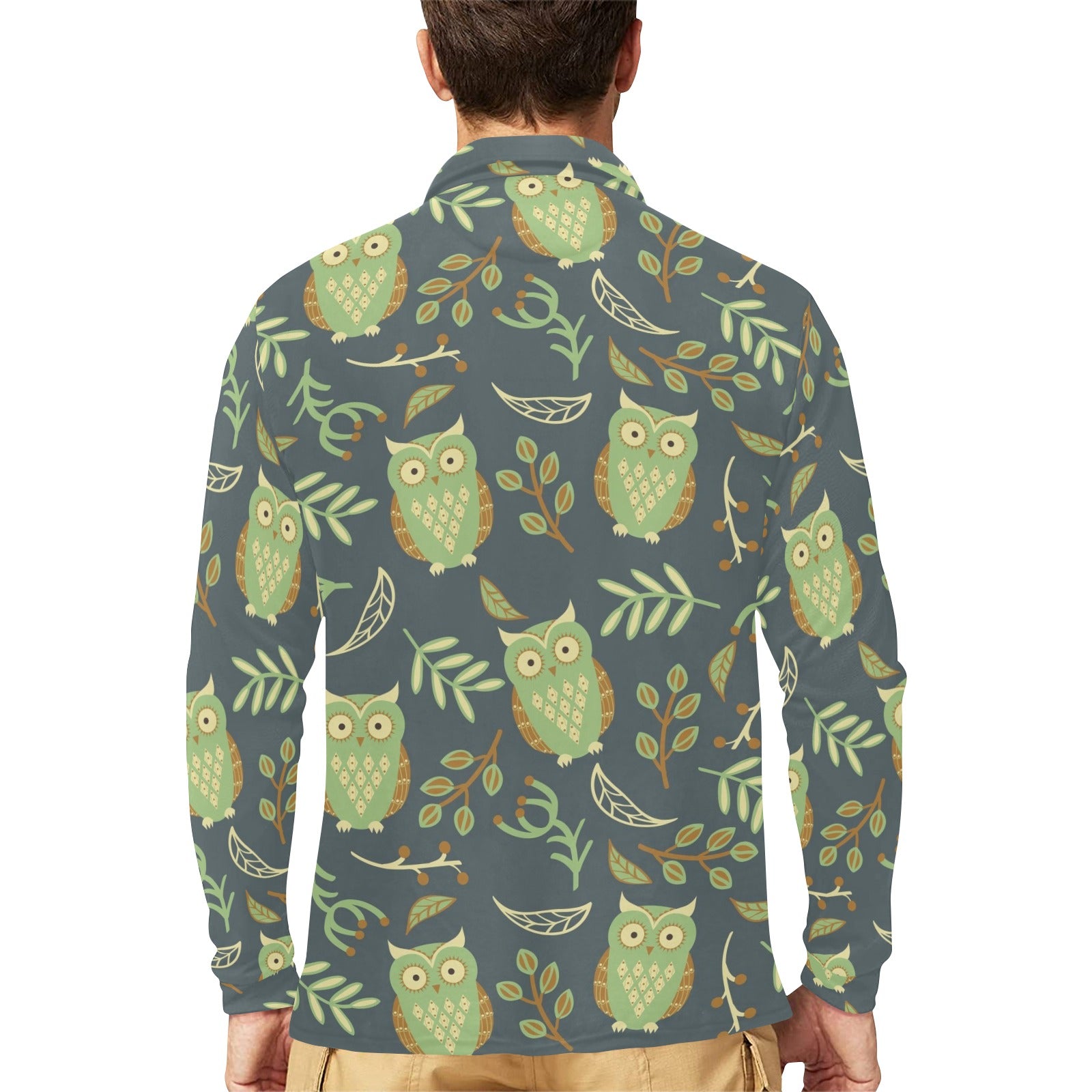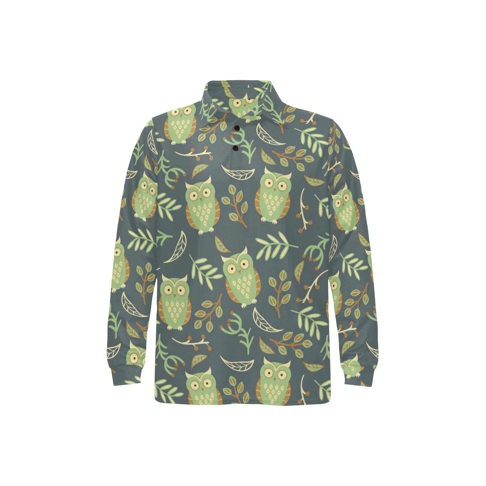 Cute owls leaves pattern Men's Long Sleeve Polo Shirt
