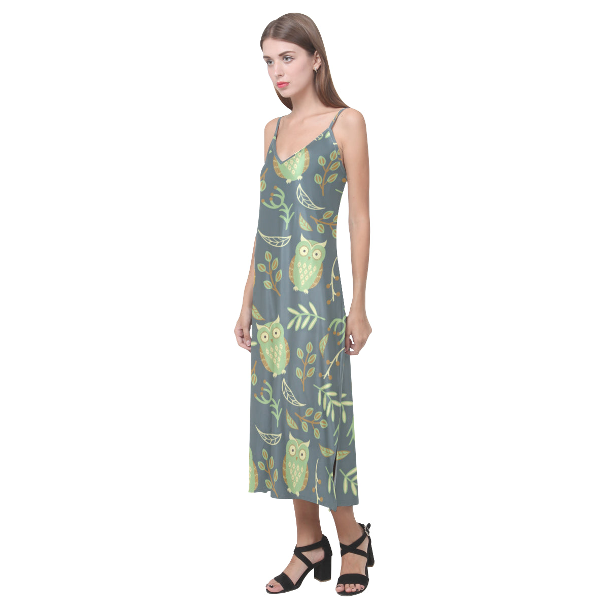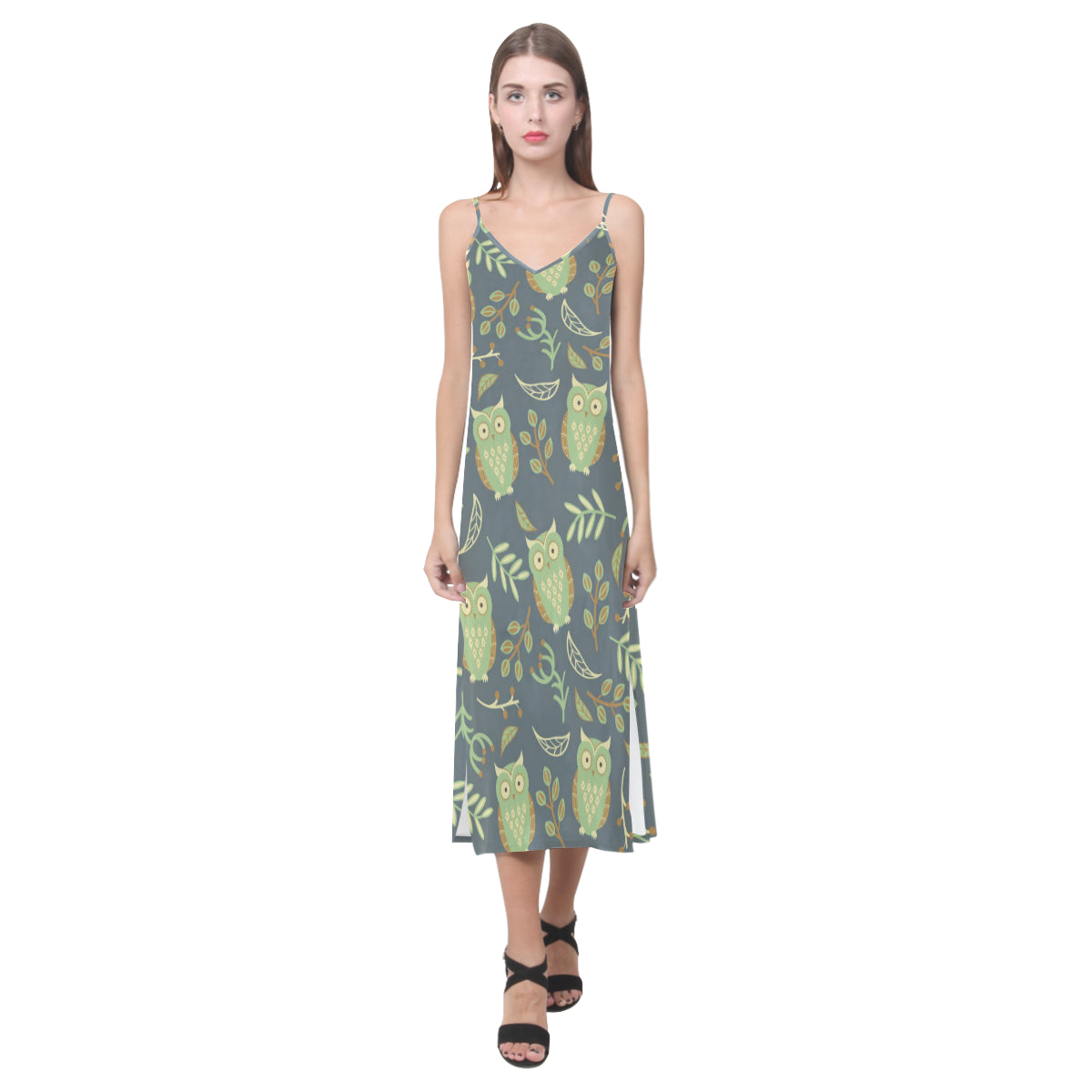 Cute owls leaves pattern V-Neck Open Fork Long Dress is a uniqued design and limited item. It made to order, hand printed, and sewn with love in our factory.