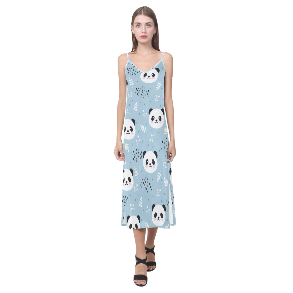 Cute panda pattern V-Neck Open Fork Long Dress is a uniqued design and limited item. It made to order, hand printed, and sewn with love in our factory.