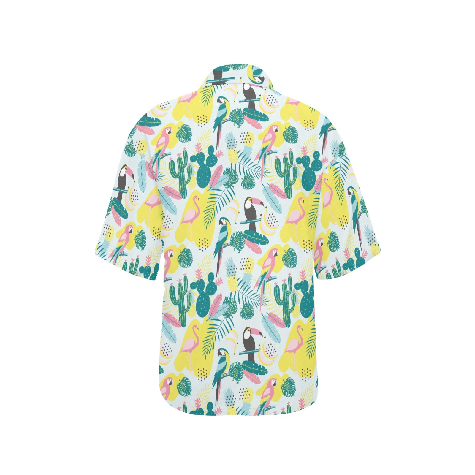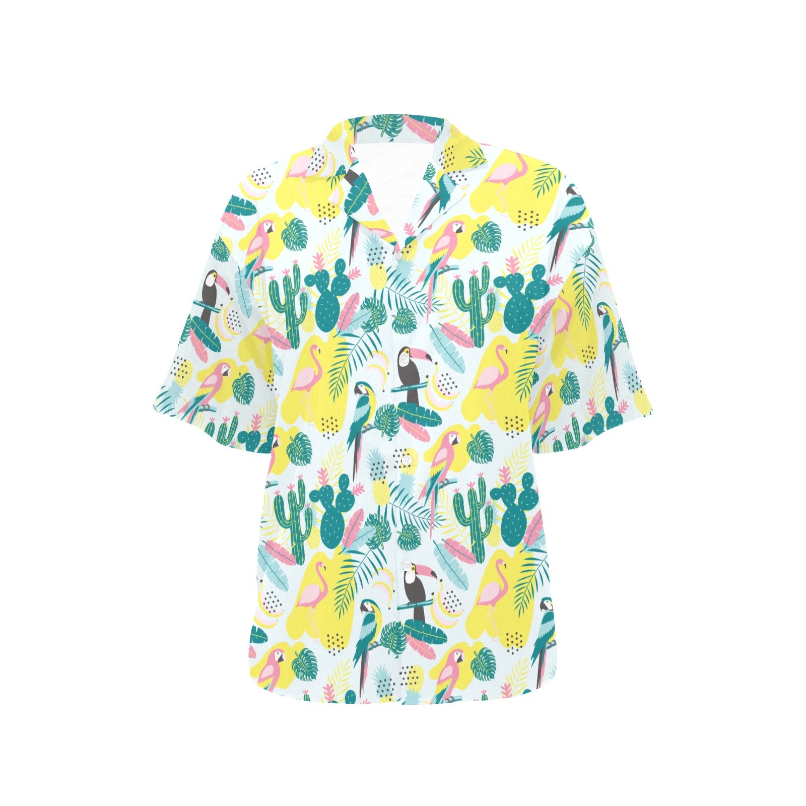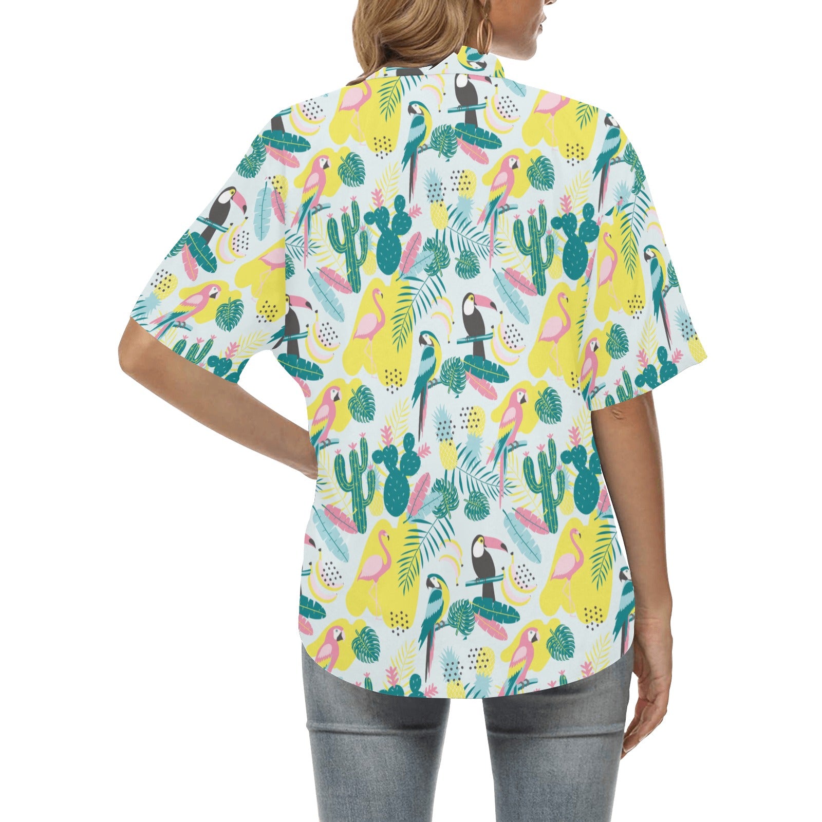 Cute parrot toucan flamingo cactus exotic leaves p Women's All Over Print Hawaiian Shirt
