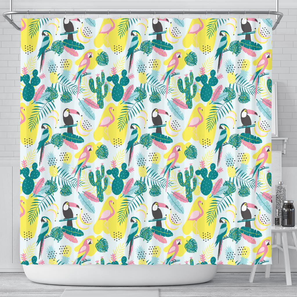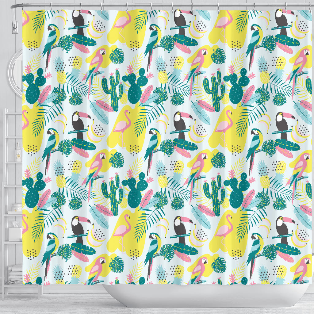 Cute Parrot Toucan Flamingo Cactus Exotic Leaves Pattern Shower Curtain Fulfilled In US