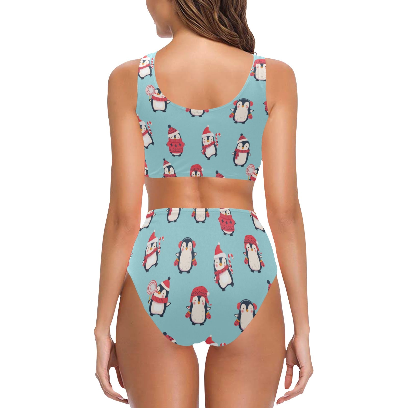 Cute penguin christmas design pattern Chest Bowknot High Waisted Bikini Swimsuit