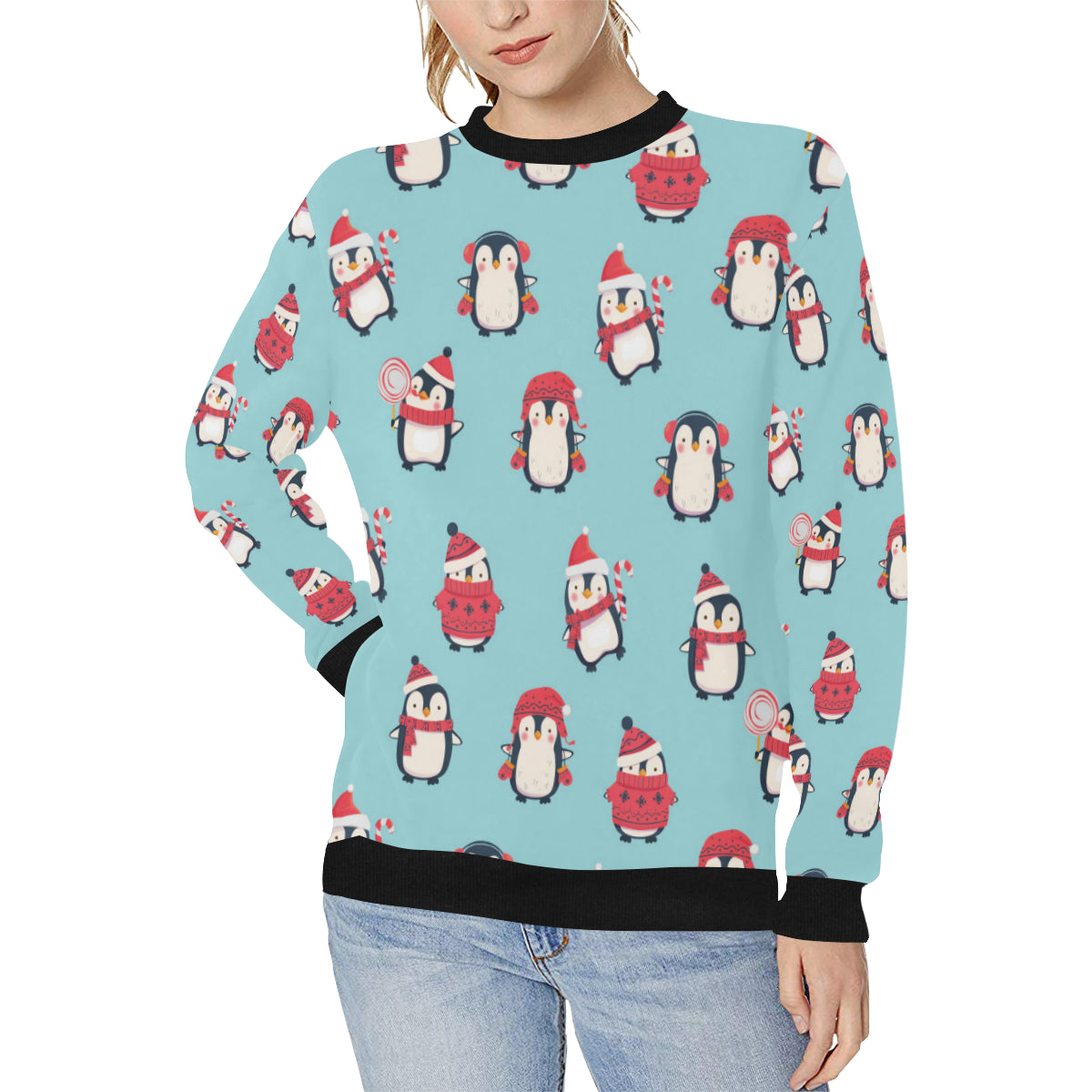 Cute penguin christmas design pattern Women's Crew Neck Sweatshirt is a uniqued design and limited item. It made to order, hand printed, and sewn with love in our factory.