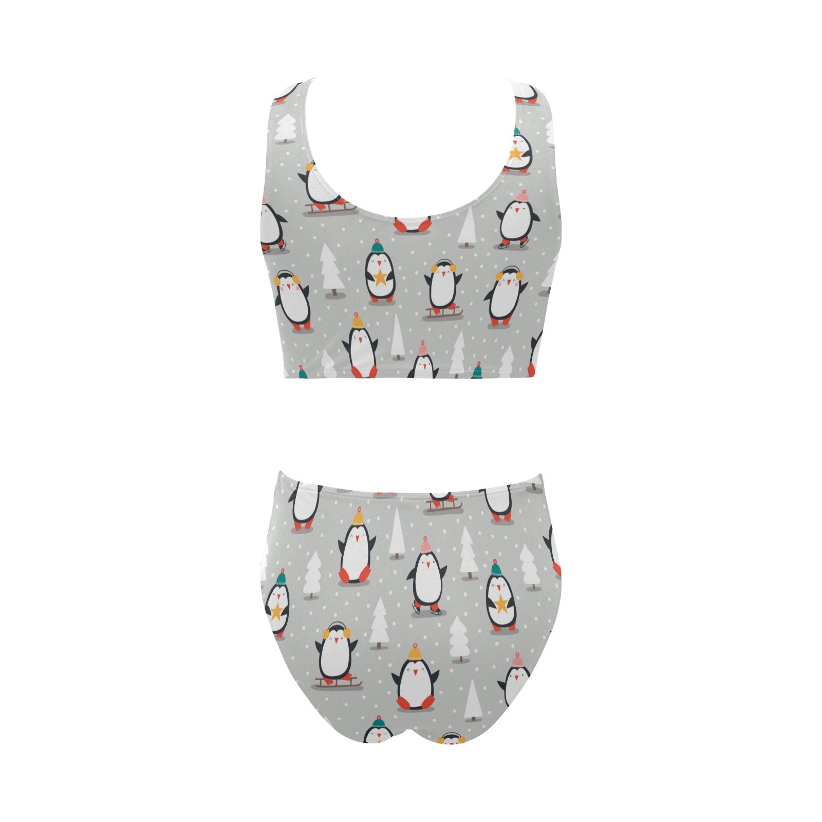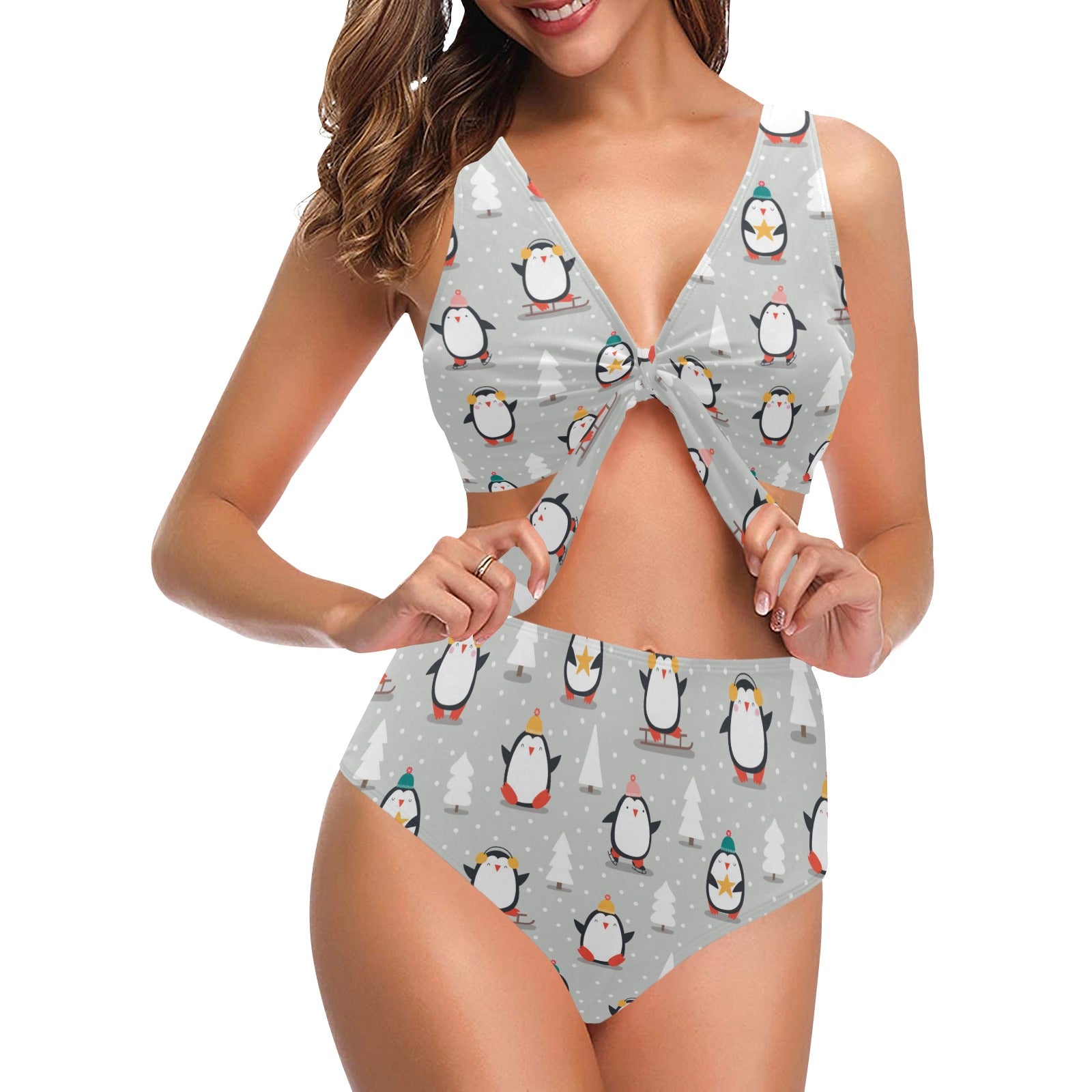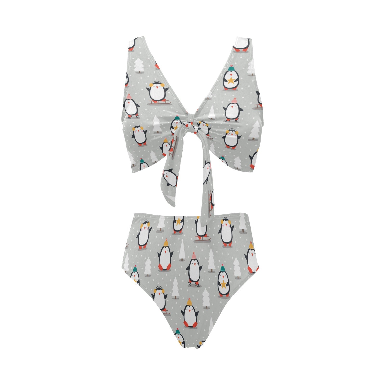 Cute Penguin christmas pattern Chest Bowknot High Waisted Bikini Swimsuit
