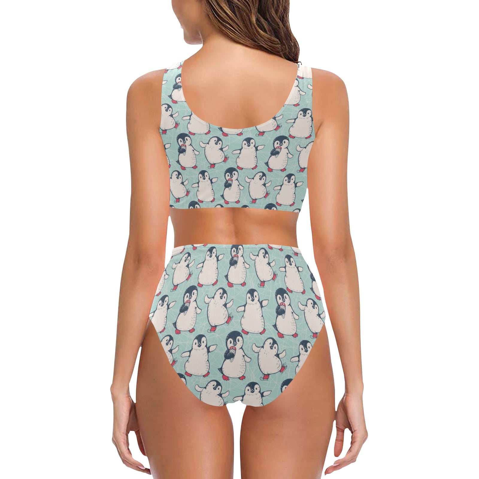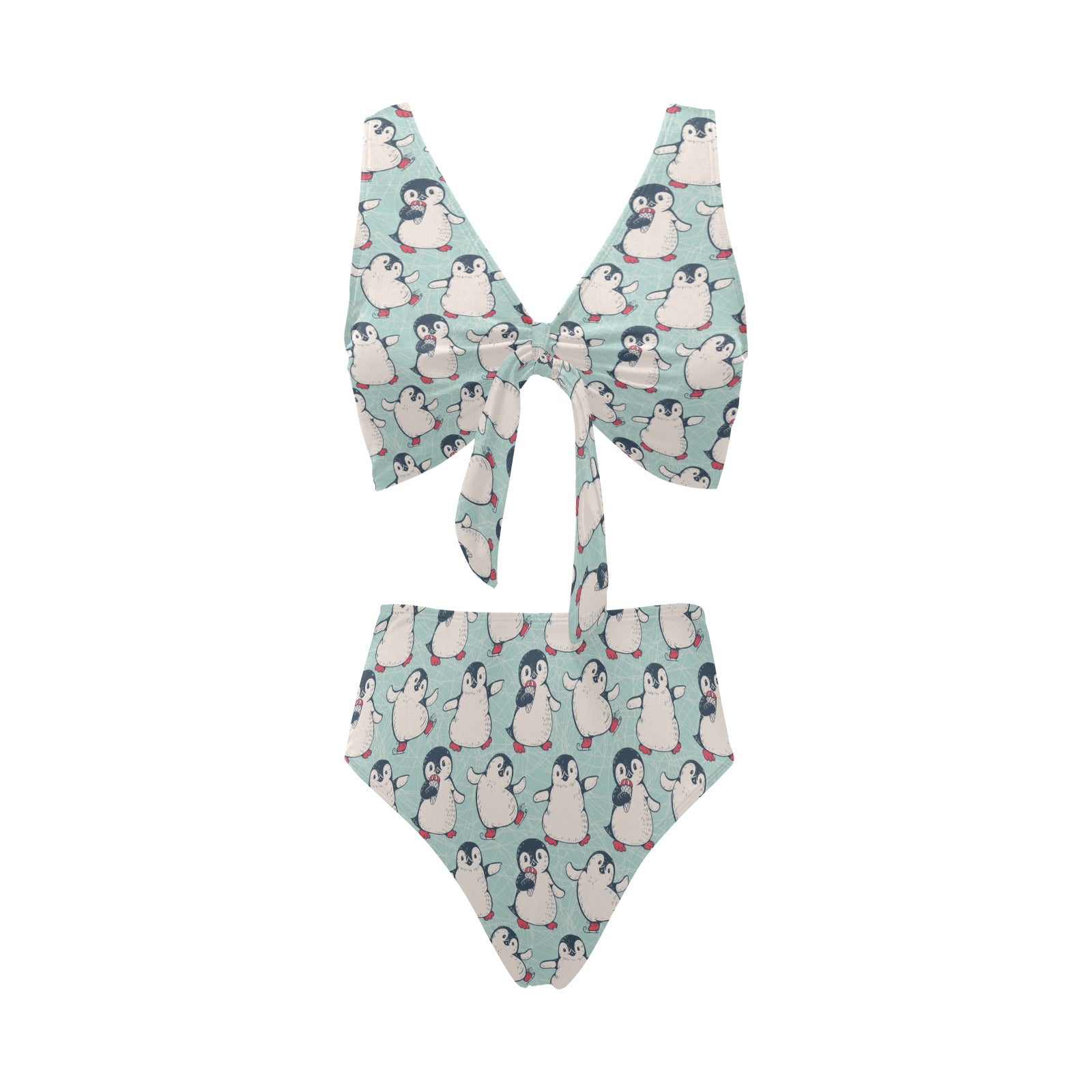 Cute Penguin pattern Chest Bowknot High Waisted Bikini Swimsuit
