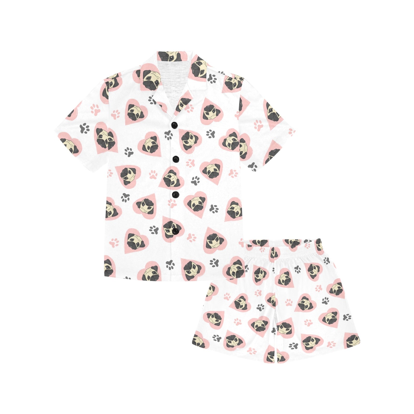 Cute pugs pink heart paw pattern Kids' Boys' Girls' V-Neck Short Pajama Set