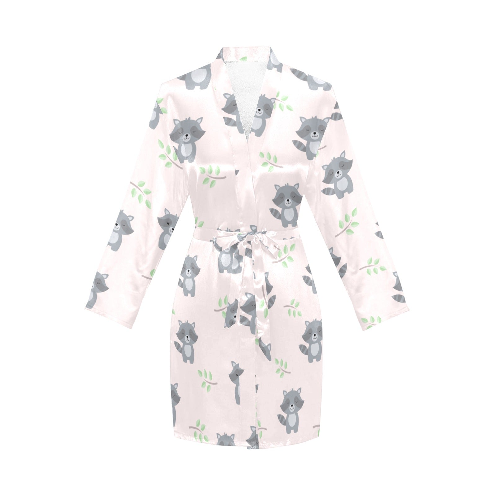 cute raccoons leaves pattern Women's Long Sleeve Belted Night Robe